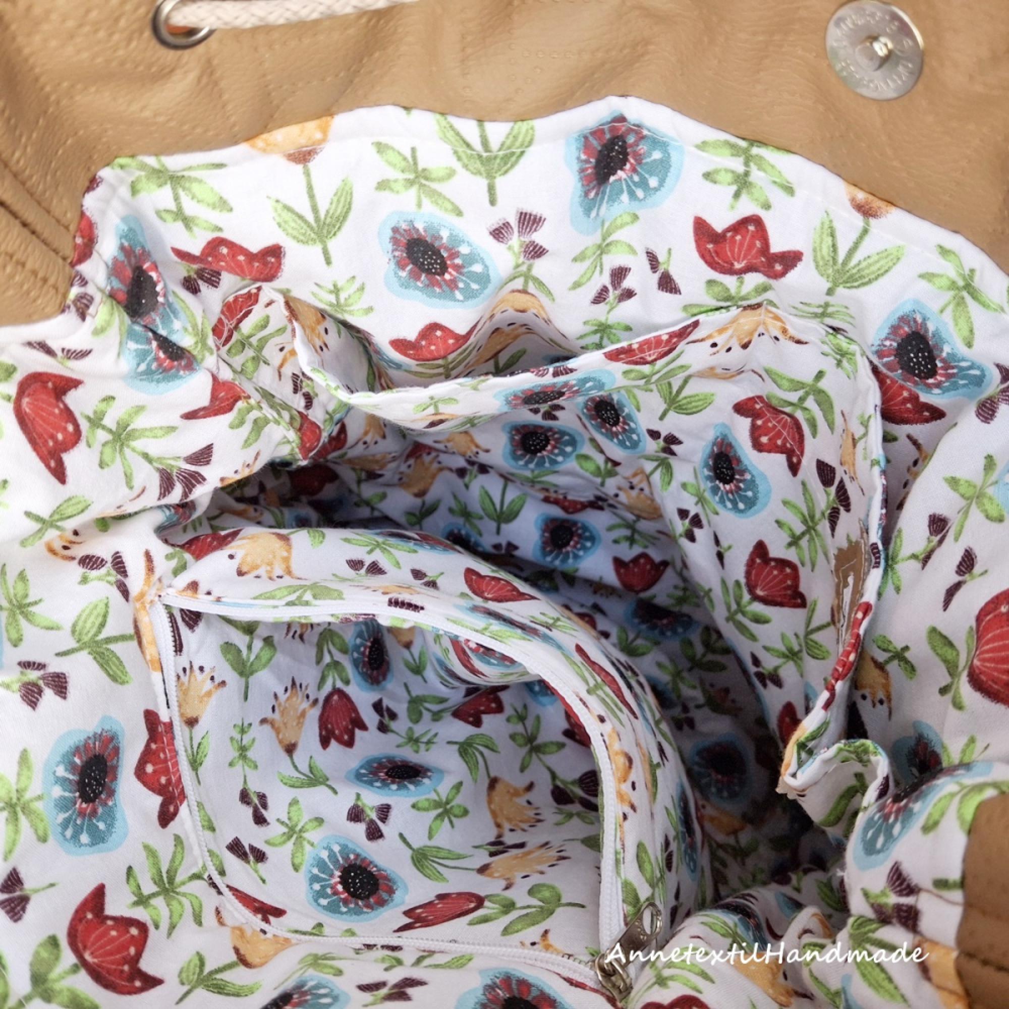 Ezt a modellt magyar népi, kalocsai virágos motívummal készítettem, melyet textilbőrökből varrtam fel a táska elejére, majd a szárakat kézzel hímeztem. Hagyományőrző stílusával bármely korosztály számára egyedi ajándék lehet. A fotókon látható modell 3 az 1-ben többfunkciós táska, mely a pántok megfelelő helyre csatolásával viselhető hátizsákként, vagy válltáskaként, vagy testen keresztben átvetve. A tetején vastag zsinórral tudod összehúzni, melyeket ringlikbe fűztem, belül középen a záródását még egy mágneses patent is biztosítja. Hátul fent van egy rövid fogója amivel kézben is meg tudod fogni. Erős, vas alapú karabinerekkel és szegecseléssel készítem a vállpántot. A táska saját szabásminta alapján készült. Anyaga kívül : őzbarna színű bútoripari szövet, szteppelt mintás őzbarna textilbőr a motívum préselt szintetikus rostbőrből készült, mely étcsokoládé barna színű. Bélés: fehér alapon népies virágmintás pamutvászon. Belső része: egyterű, jó pakolós méretű, az egyik oldalon nagy osztott zsebekkel, a másik oldalon cipzárral zárható zsebbel így mindent kényelmesen el tudsz benne rendezni. Mérete: - magassága 38 cm - szélessége fent 34 cm - talpa 10x25 cm - vállpántok 65-110 cm között szabályozhatók, melyek erős, vas alapú karabinerekkel csatlakoznak. - Önsúly kb. 550 gramm, az egyes modellek súlya némileg eltérő lehet.