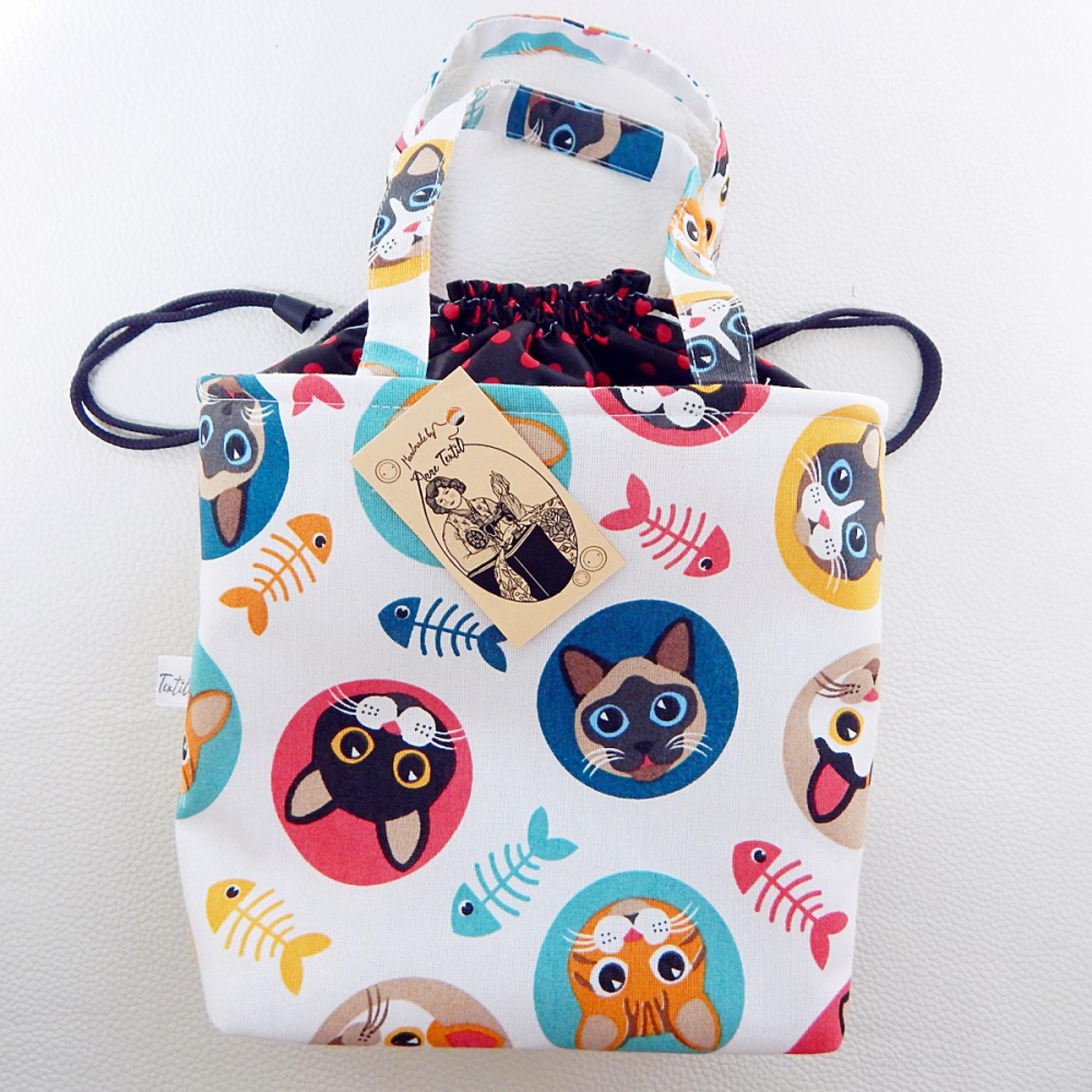 Ez a táska kívül cica portrés mintás és pöttyös mintás prémium minőségű lonetta és pamutvászon, belül vízhatlan fehér Pul anyagokból készült, a rétegek között bevasalt merevítő, és puha vlis lap fokozza tartását, és enyhe hőtartö tulajdonságát. A táska zsinórral összehúzható és kézi fogóval is rendelkezik. Kids Bag - Uzsonnás táska mérete: - magasság 27 cm, - szélesség 27 cm, - talpa 15 x12 cm A PUL belső rész vízhatlan, nedves szivaccsal lemosható, letörölhető, a felhasznált anyagok Oeko-Tex minősítéssel rendelkeznek. Önsúly kb. 150 gramm