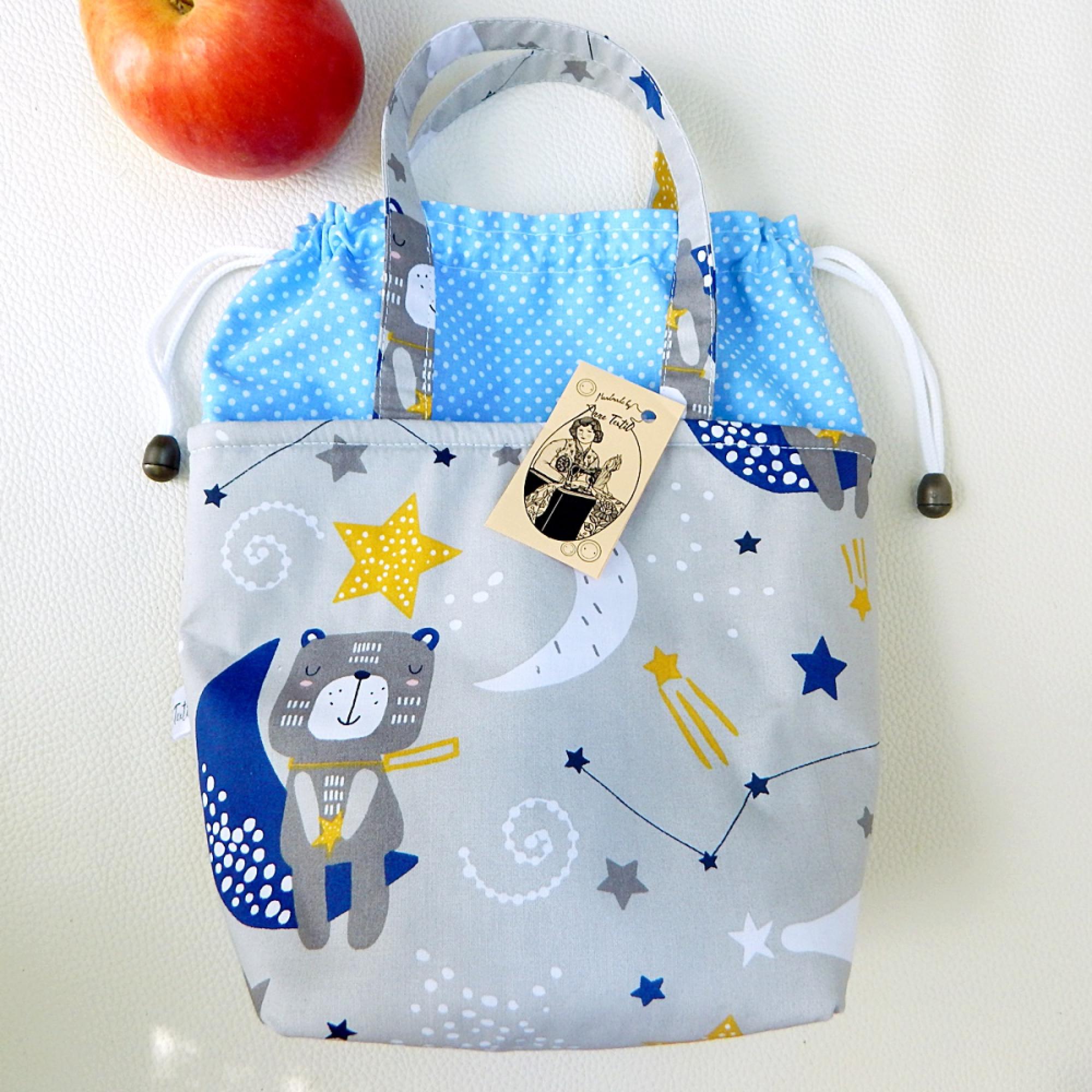 Ebben az ajánlatban kis méretű, elsősorban gyerekek részére tervezett maci a holdon mintás és világoskék alapon fehér pöttyös mintás vászonból készült 2 részes táska szettet hoztam, melynek bélése vízhatlan, nedves szivaccsal letörölhető pul béléssel készült, a rétegek között merevítőkkel erősítettem. A szalvéta tépőzárakkal, a táska két oldalról zsinórral nyitható-zárható. A szett részei méretekkel: TÁSKA: Magassága 28 cm, szélessége 27 cm, talpa 13x14 cm SZALVÉTA: 30 x 30 cm A feltüntetett ár a teljes 2 db-ból álló szettre vonatkozik.