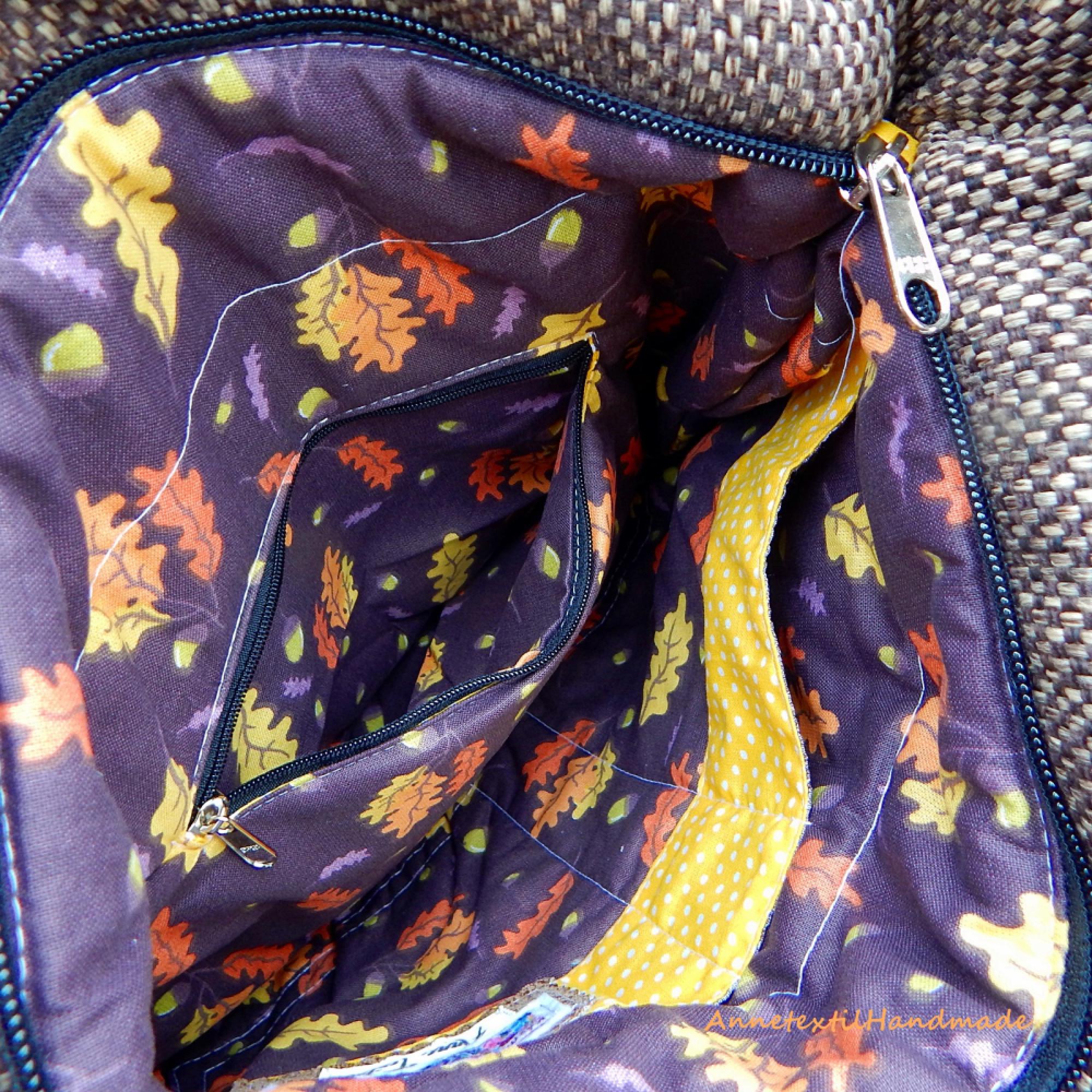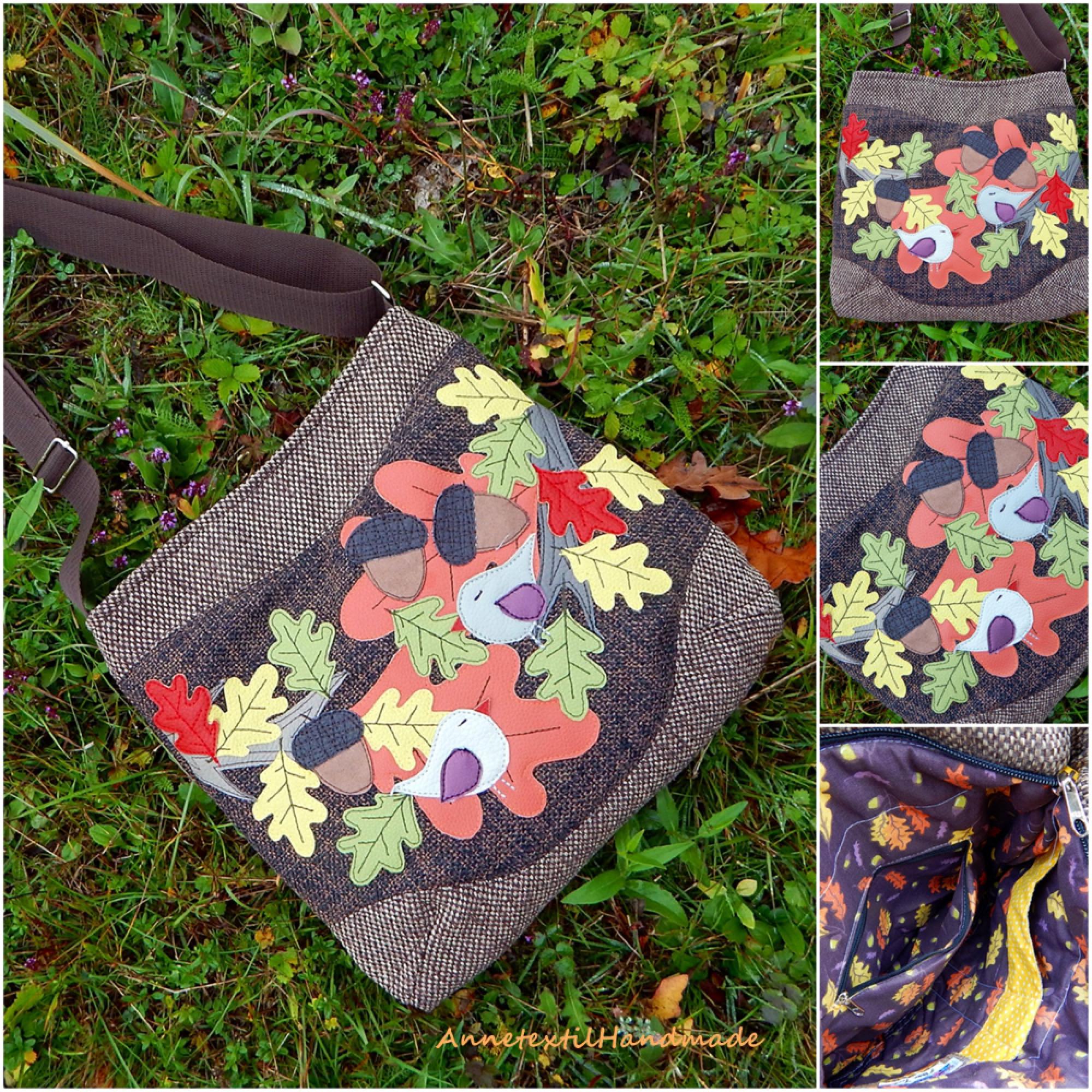 Cross Bag kollekcióban keresztben átvetős, és válltáskaként viselhető állítható pántos közepes méretű, pakolós táskákat készítek különböző technikákkal. Az őszi erdő színes világa inspirálta a létrejöttét ennek madaras, tölgyes Midi Cross Bag, válltáskának. Ezt a táskát textilbőrből varrógéppel felvarrt motívumokkal, applikációs technikával készítettem, melyet egyedileg terveztem. Több rétegű, jó tartású, formatartó. A táska maga süllyesztett cipzárral záródik Anyaga: kétféle sötétbarna tweed, bútorszövet, vállpántja 4 cm széles táskaheveder. Bélése: barna alapon őszi levél mintás pamutvászon, melyben 2 db nyitott zsebet, egy cipzárral zárható zsebet és egy tollőrző rekeszt készítettem. Méretei: - magasság 34 cm, - szélesség 32 cm, - talpa 39 x 10 cm, - vállpánt 70-130 cm-ig szabályozható táskaheveder fém szerelvényekkel, - Önsúly 400 gramm