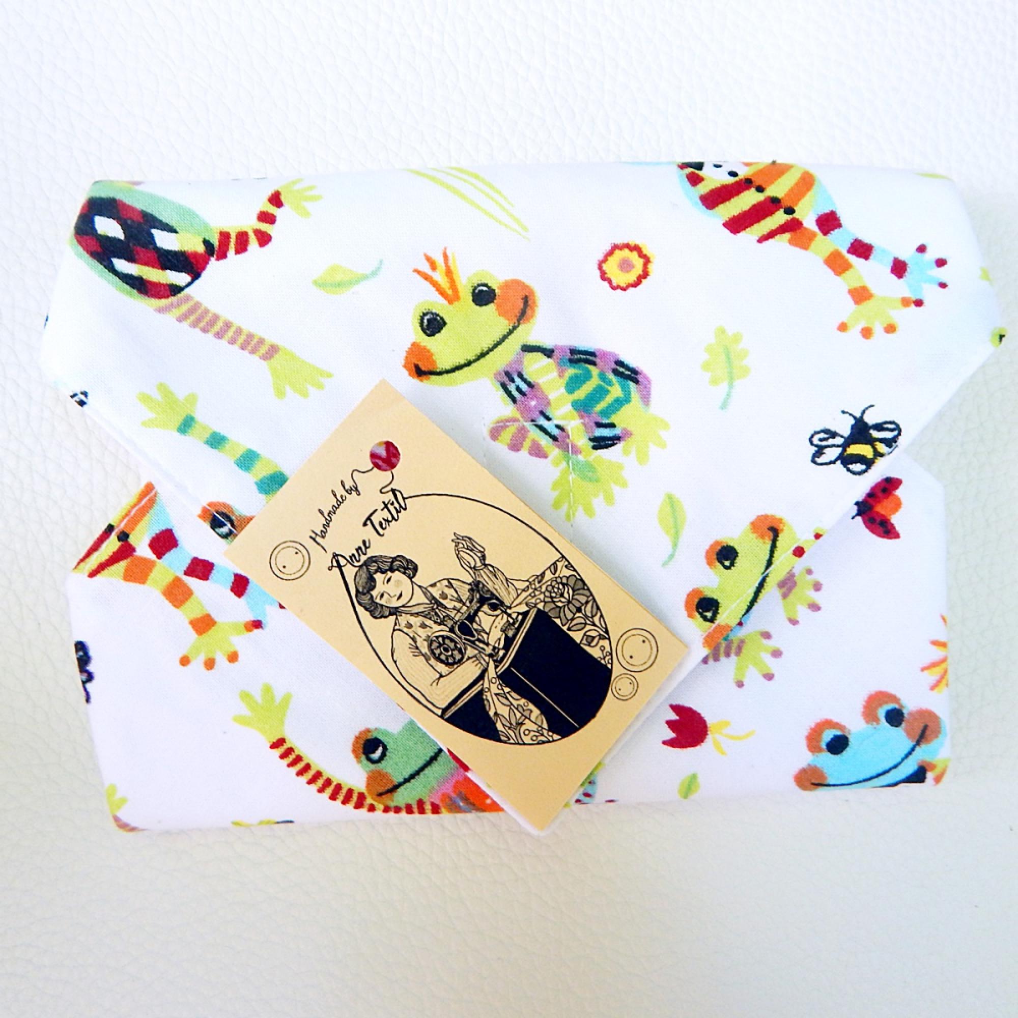 Környezetbarát csomagoláshoz 1-1 szendvicshez tudod használni vízhatlan újraszalvétáimat. A szalvéták külső oldala megerősített pamutvászon. Belseje vízhatlan, légáteresztő PUL anyag, mely nedves szivaccsal könnyedén letörölhető. Minden darab három rétegű, erős és tartós. Formatervezésnél az egyik sarkát levágtam, követve a hagyományos borítékok formáját, a négy sarokra tépőzárat varrtam, mellyel fixen tudod rögzíteni, méretét szabályozni. Használata könnyű és praktikus, könnyen megszerethető. Mosás max. 40 fokon. A pamut anyag alapvető tulajdonsága miatt az első mosásnál, vagy magasabb hőfokon történő mosásnál minimálisan még összemehet, annak ellenére hogy be vannak avatva. Szárítógépbe ne tedd, mert a PUL anyag nem szereti. Vasalni csak a pamut oldalt szabad. Normál méret: 30 x 30 cm 2090 ft Kis méret: 28,5x28,5 cm 1870 ft érdeklődj melyik van készleten