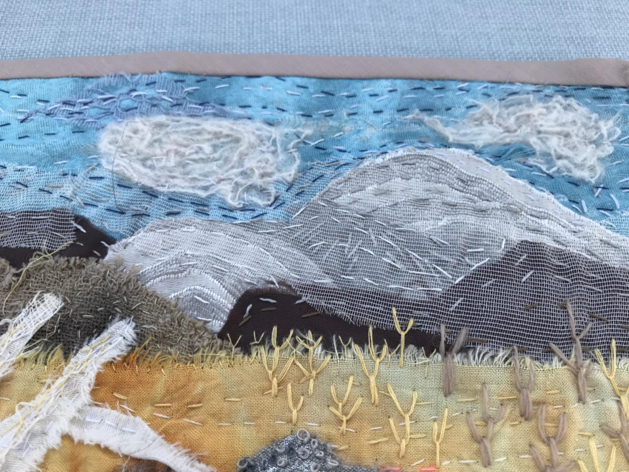 Hímzett fali dekoráció. Vegyes technikával: textil, hímzőfonal használatával készült, kézimunka. Festmény hatású, mégis a motívumok 3D hatásával életre kell, így részévé válik a környezetének. Hangulatos tájkép, homogén színei kellemesen illik bármilyen helységben. Otthonába vagy munkahelyén egyaránt.