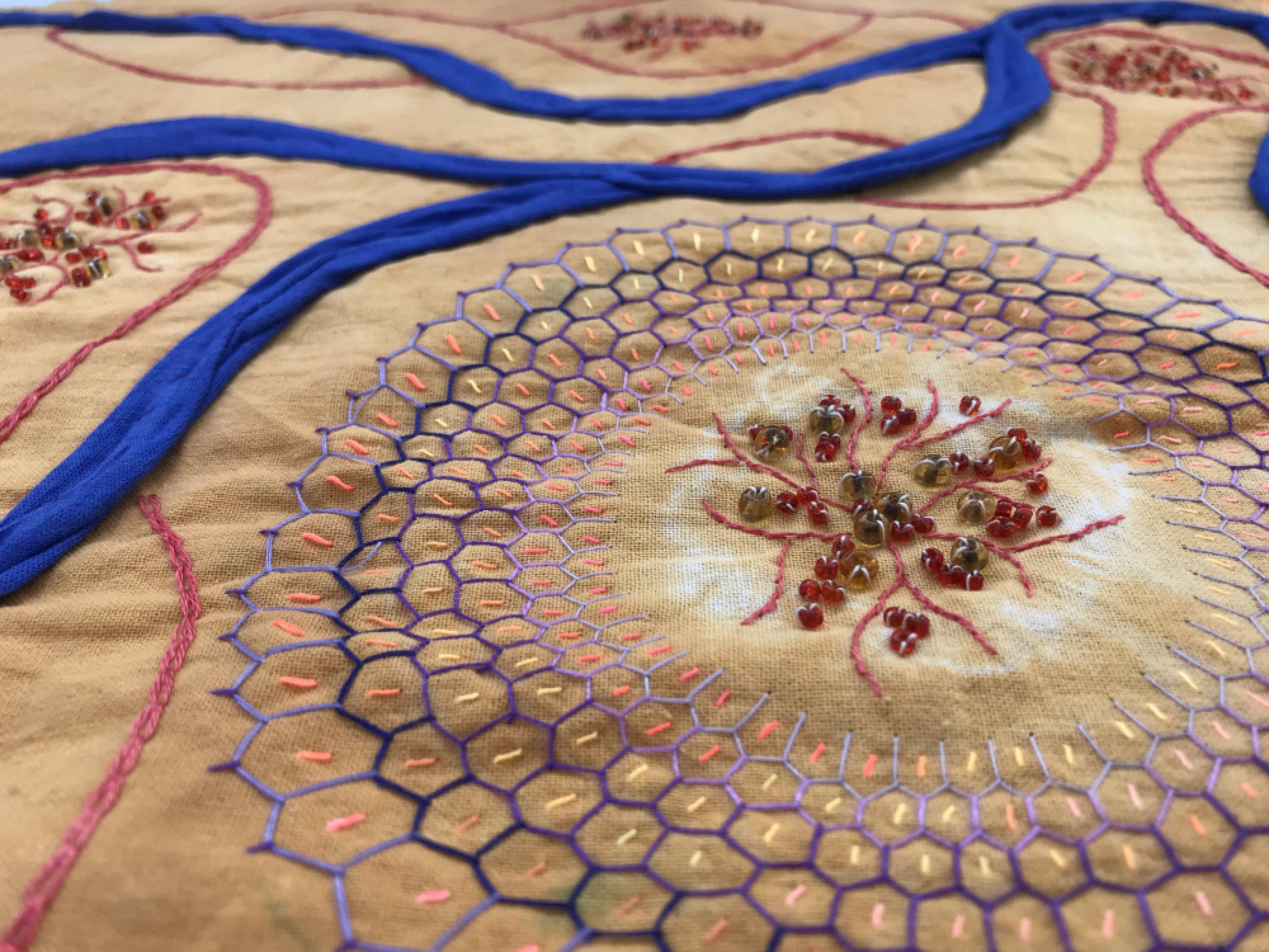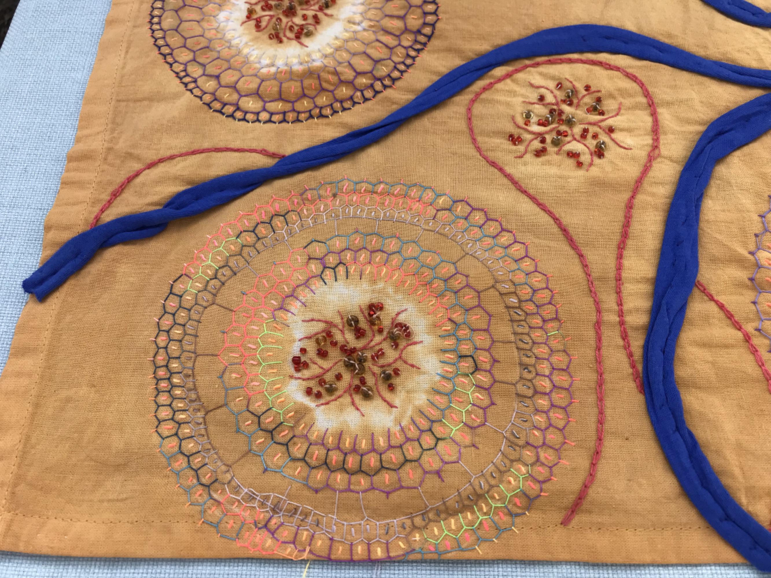 Kézzel hímzett fali dekoráció. Batikolt narancs árnyalatú pamut anyagra hímzett hálómotívum, gyöngyökkel díszítve, kék pólófonal rátéttel. Élénk, harmonikus színeivel, dinamikus körkörös formájával vidám hangulatot áraszt szobájában. Tisztítási javaslat: Távolítsa el a porszívó fejét, Helyezzen a porszívó csövére egy zsebkendőt, vagy anyag darabot. Állítsa a porszívó szívóerejét a minimumra, és enyhén megdőltve,-nem merőlegesen- egyszerűen tisztítható. Vagy csak rázza ki belőle a port. Csak kézi mosást alkalmazzon, ha nedvesen akarja tisztítani.