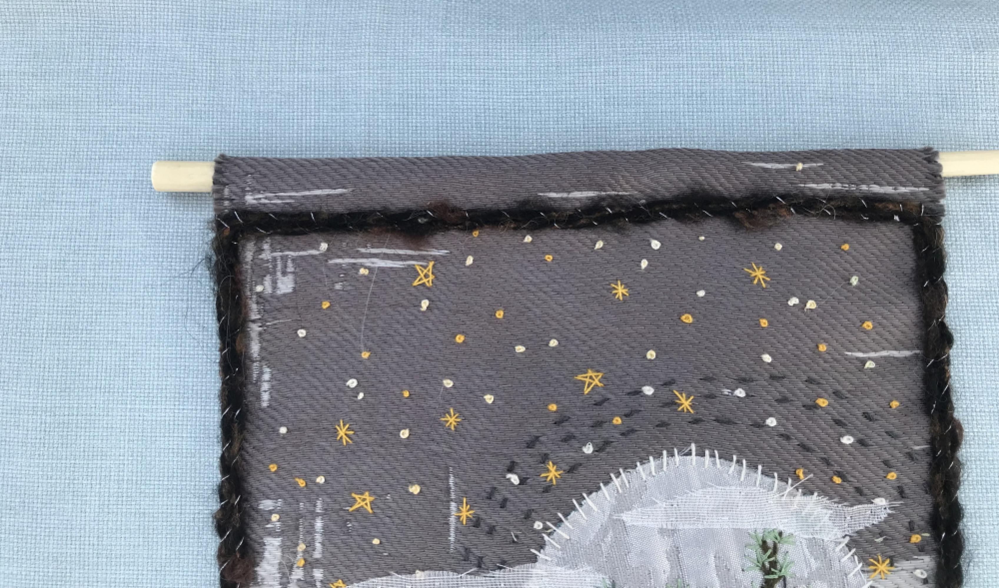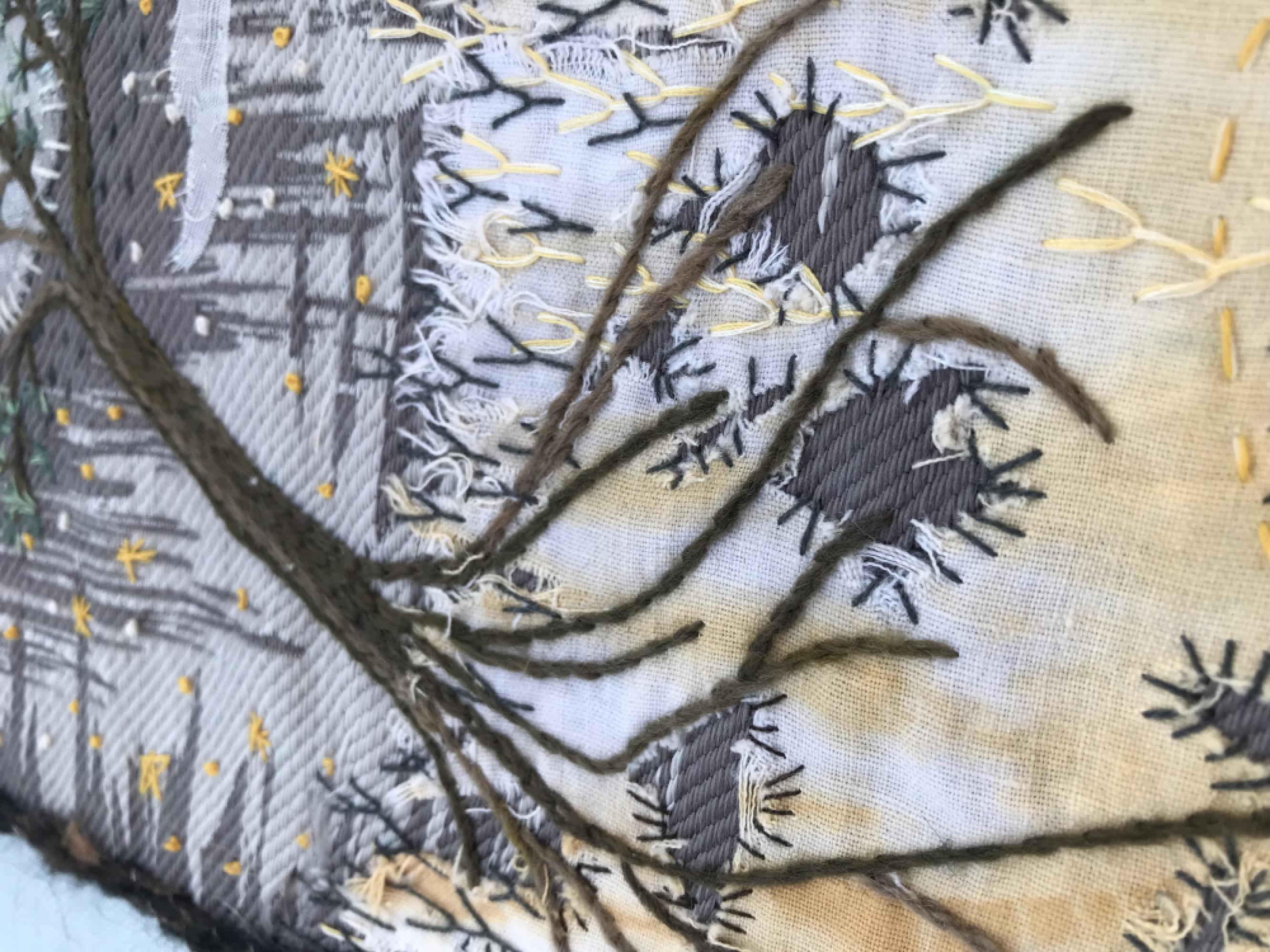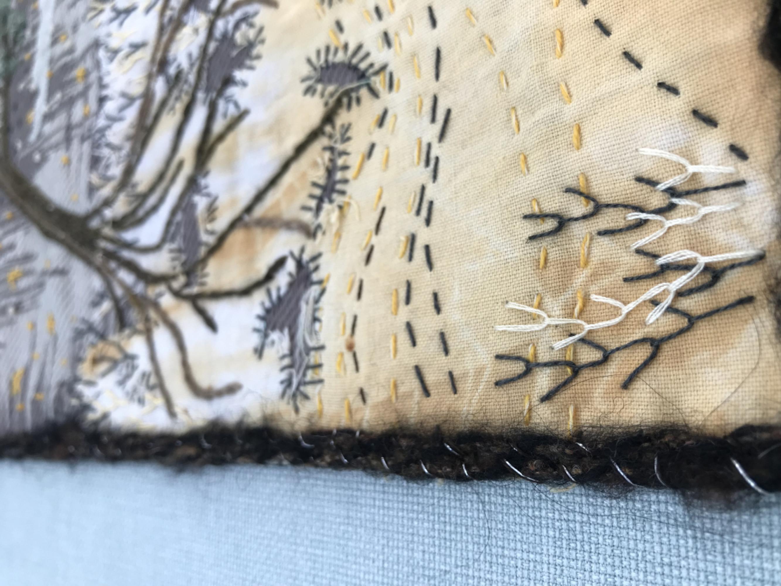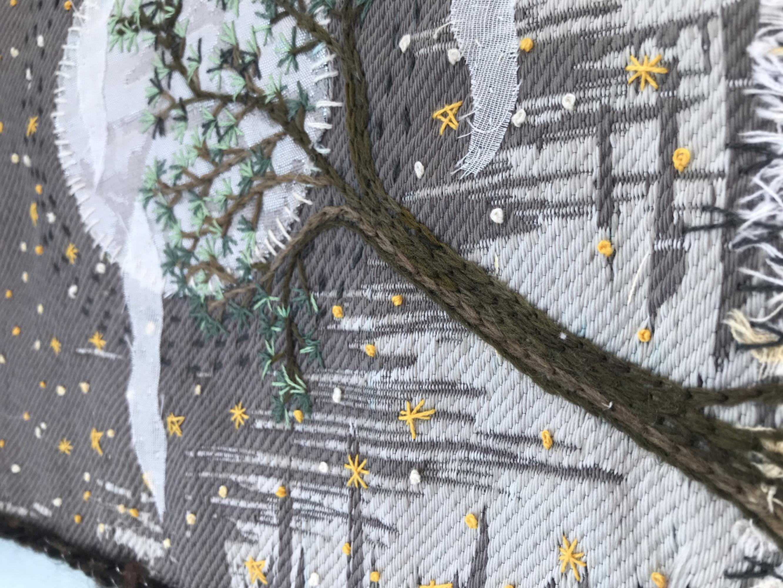 Hímzett fali dekoráció. Teljes egészében kézzel készítettem. Kevert, mixelt technikával: textil, hímzőfonal használatával. A keretet moherfonallal dísztettem. Festmény hatású, mégis a motívumok kidomborodásával életre kell, így részévé válik a környezetének. Hangulatos témája, homogén színei kellemesen illik bármilyen helységben. Otthonába vagy munkahelyén egyaránt.
