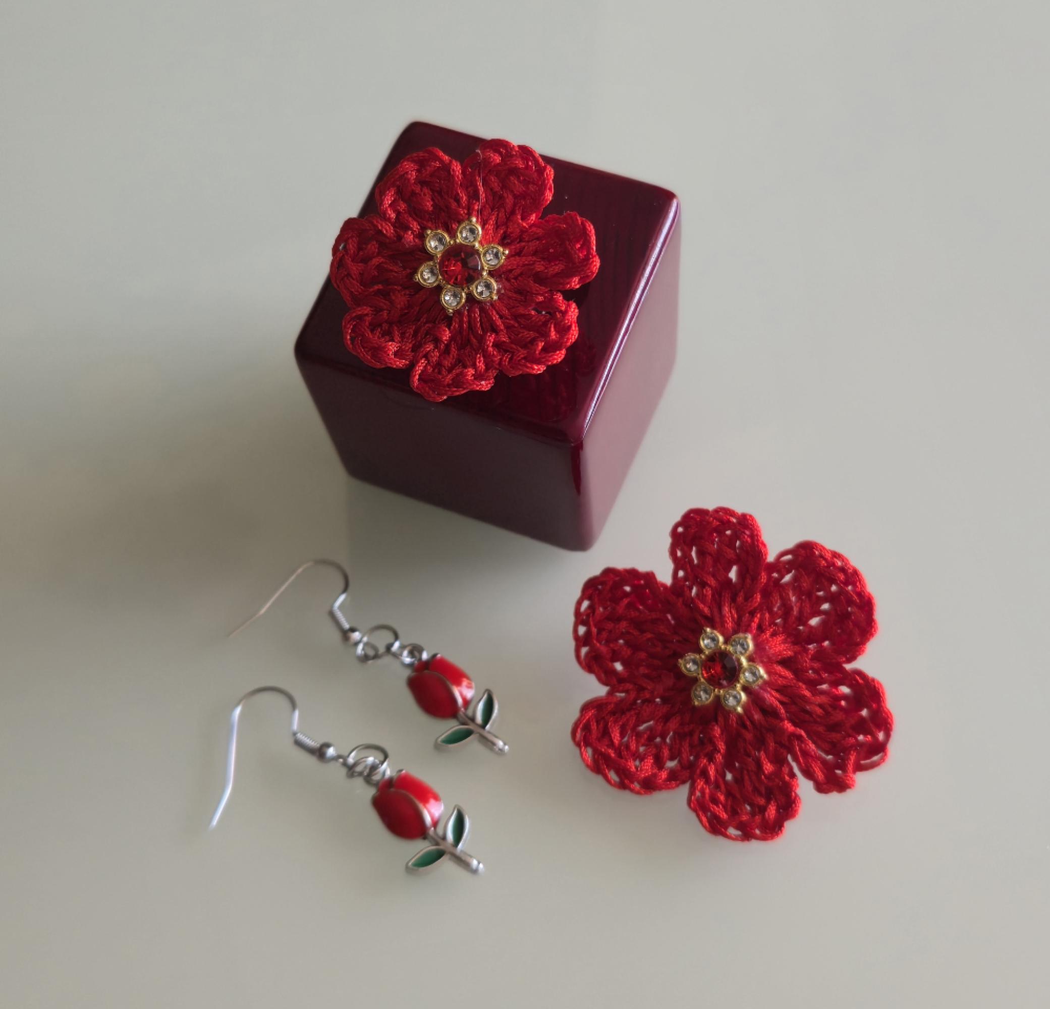 Ékszer szett. Horgolt gyűrű, Tulipanos fülbevaló,horgolt bross. Gyűrű és a bross közepét egy strasszkő diszíti. Ajándéknak is kitűnő választás!