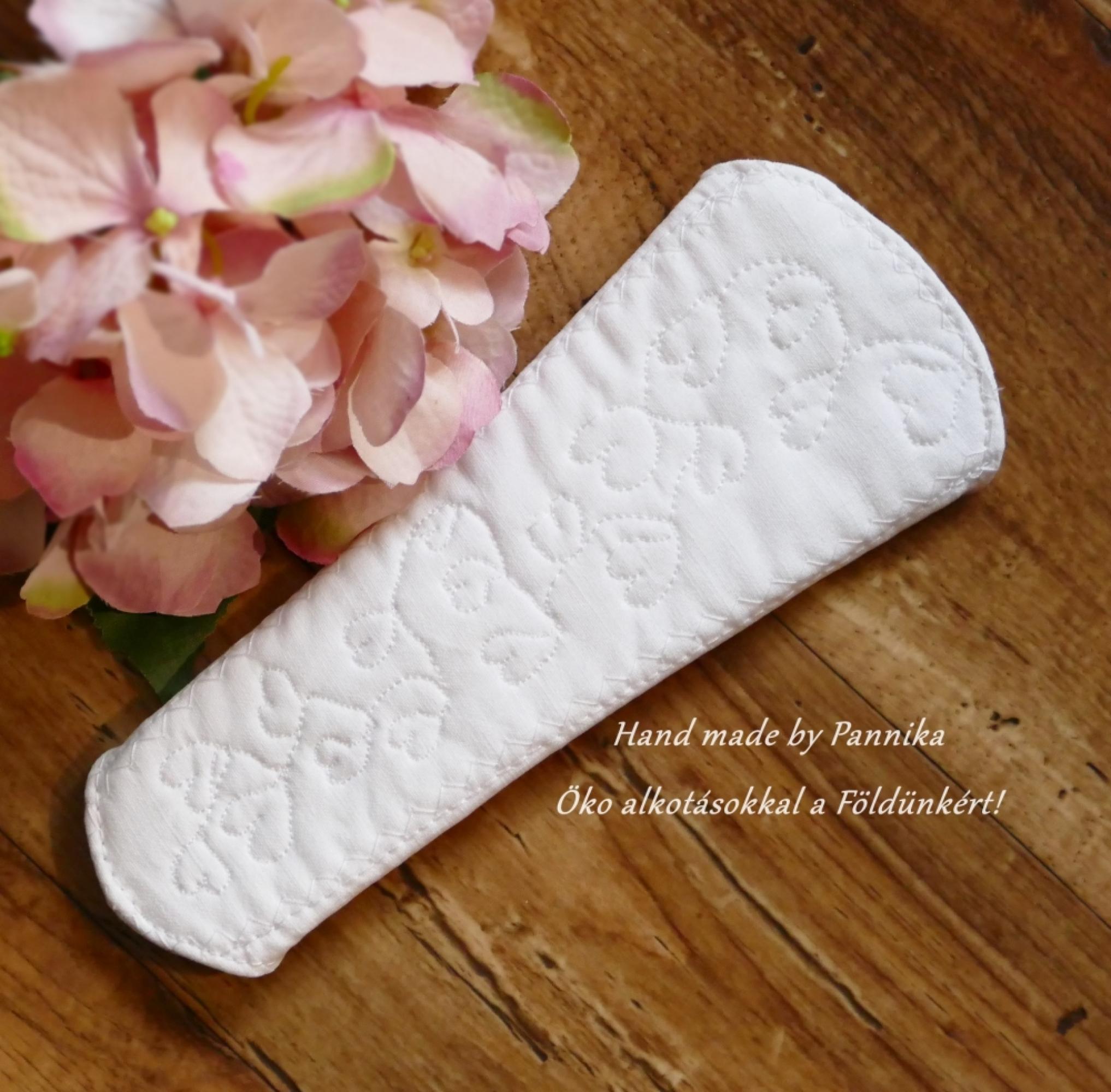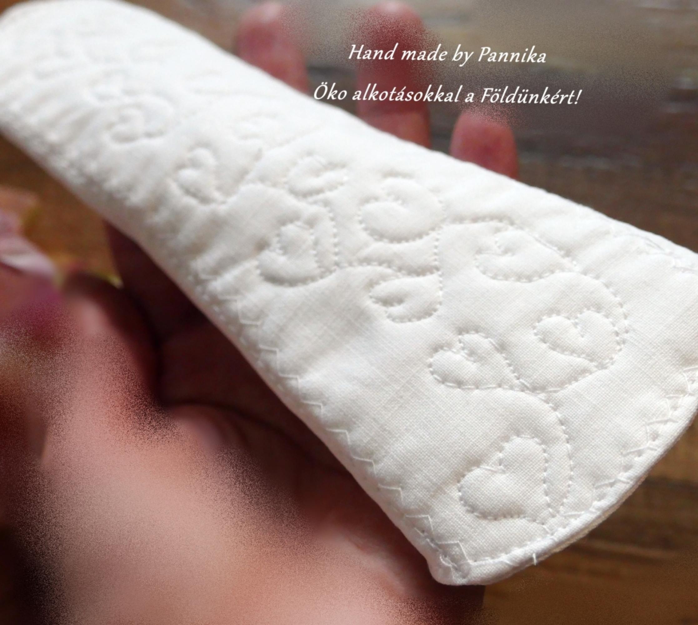 Tisztasági, intim betétet készítettem, fehér ökovászonból. Középen frottírral béleltem, amit szabadgépi tűzéssel gondosan levarrtam, hogy el ne mozdulhasson, mosás-viselés közben. magassága: 18cm szépessége fönt: 7cm lent: 3cm kinyitva: 13.5cm Környezetbarát, nowaste, Zero Waste termék Védd te is a Földünket! :) Tépőzárral rögzíthető a két szárny egymáshoz. Én jobban szeretem, mint a patentot, mert nekem ez kényelmesebb. Az anyagok avatottak. 40 fokon mosható, vasalható, nem kényes vászon. Tiszta, füstmentes környezetben készülnek, de első használat előtt mosd és vasld is ki!!