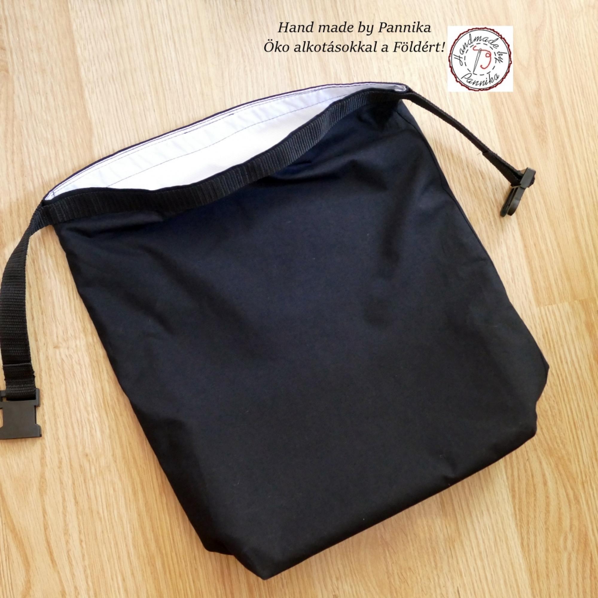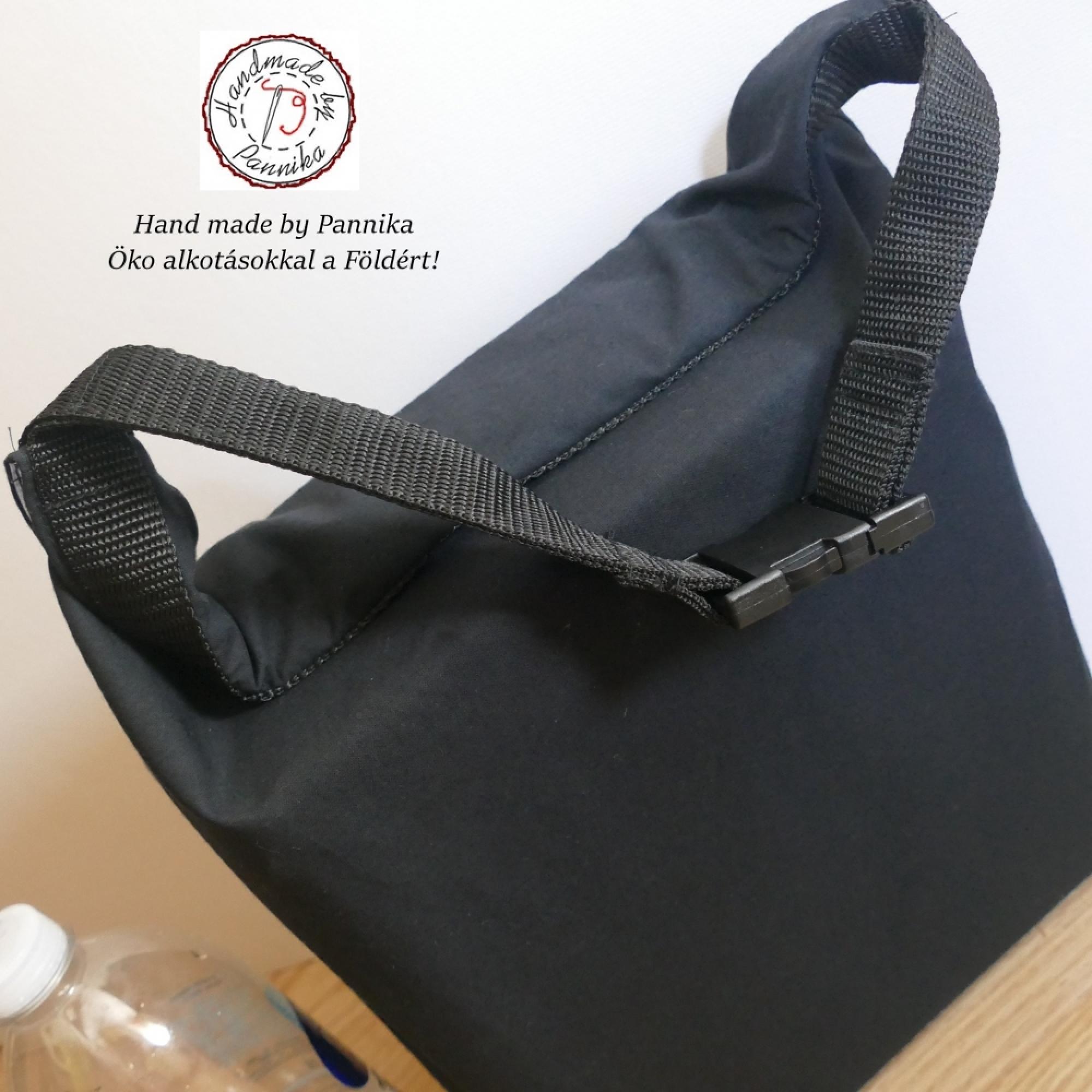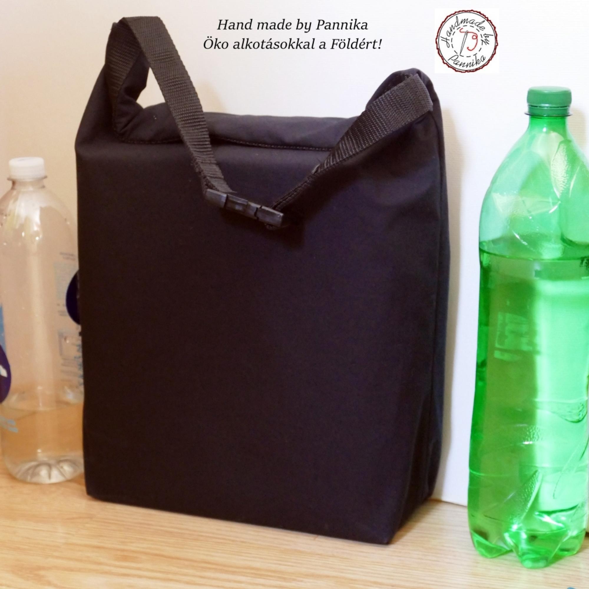 Uzsonnás táska, csatolható pánttal, hordozhatod ebbe a táskában az uzsonnát, ebédet. Nagyos nagy a pakolhatósága!! Palackot, ételhordó dobozkákat, csokit, kekszet :) mindent amit szeretnél:) VÍZHATLAN letörölhető BÉLÉSSEL. Pakold és vidd!!! ÉÉÉS: Van egy jó hírem: NEM CSAK ételhordóként, hanem akár kézi vagy válltáskaként is viheted!!! A fület nagyobbra készítettem így válladra is akasztható. FIÚK- LÁNYOK egyaránt használhatják. Praktikus , trendi, vagány mindenhez is illik. A táska külsőrésze fekete vászon, belseje fehét víztaszító szövet anyagokból készült. Mosás 30 fokon vagy kézzel. A belsejét kihuzhatod és kitörölheted, ha kell. Nem kell állandóan mosni az egész tasit. NE száritógépezd! Vasaláskor húzd ki a belső anyagot és azt ne vasald, mert a vasaló összerántja!! Mérete bezárva: 33 magas, de lejjebb tekerhető akár 20cm-ig. Még akkor is szép. szélessége: fent 36cm lent 26,5cm talpszél 11cm a pánt 38cm Ha vállra vennéd: a táskával a vállkör:74cm