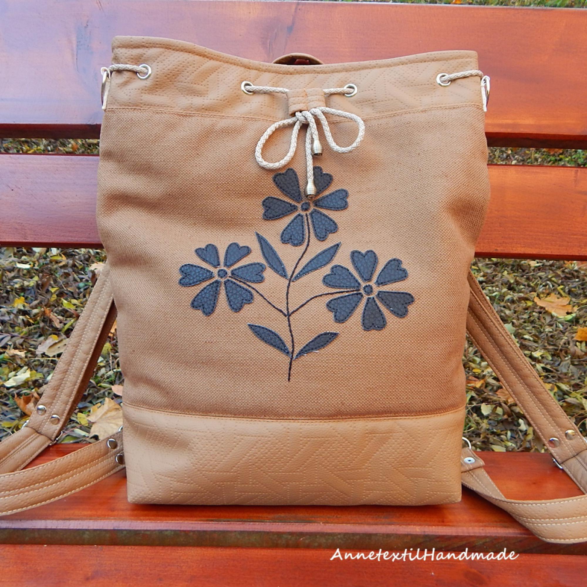 Ezt a modellt magyar népi, kalocsai virágos motívummal készítettem, melyet textilbőrökből varrtam fel a táska elejére, majd a szárakat kézzel hímeztem. Hagyományőrző stílusával bármely korosztály számára egyedi ajándék lehet. A fotókon látható modell 3 az 1-ben többfunkciós táska, mely a pántok megfelelő helyre csatolásával viselhető hátizsákként, vagy válltáskaként, vagy testen keresztben átvetve. A tetején vastag zsinórral tudod összehúzni, melyeket ringlikbe fűztem, belül középen a záródását még egy mágneses patent is biztosítja. Hátul fent van egy rövid fogója amivel kézben is meg tudod fogni. Erős, vas alapú karabinerekkel és szegecseléssel készítem a vállpántot. A táska saját szabásminta alapján készült. Anyaga kívül : őzbarna színű bútoripari szövet, szteppelt mintás őzbarna textilbőr a motívum préselt szintetikus rostbőrből készült, mely étcsokoládé barna színű. Bélés: fehér alapon népies virágmintás pamutvászon. Belső része: egyterű, jó pakolós méretű, az egyik oldalon nagy osztott zsebekkel, a másik oldalon cipzárral zárható zsebbel így mindent kényelmesen el tudsz benne rendezni. Mérete: - magassága 38 cm - szélessége fent 34 cm - talpa 10x25 cm - vállpántok 65-110 cm között szabályozhatók, melyek erős, vas alapú karabinerekkel csatlakoznak. - Önsúly kb. 550 gramm, az egyes modellek súlya némileg eltérő lehet.