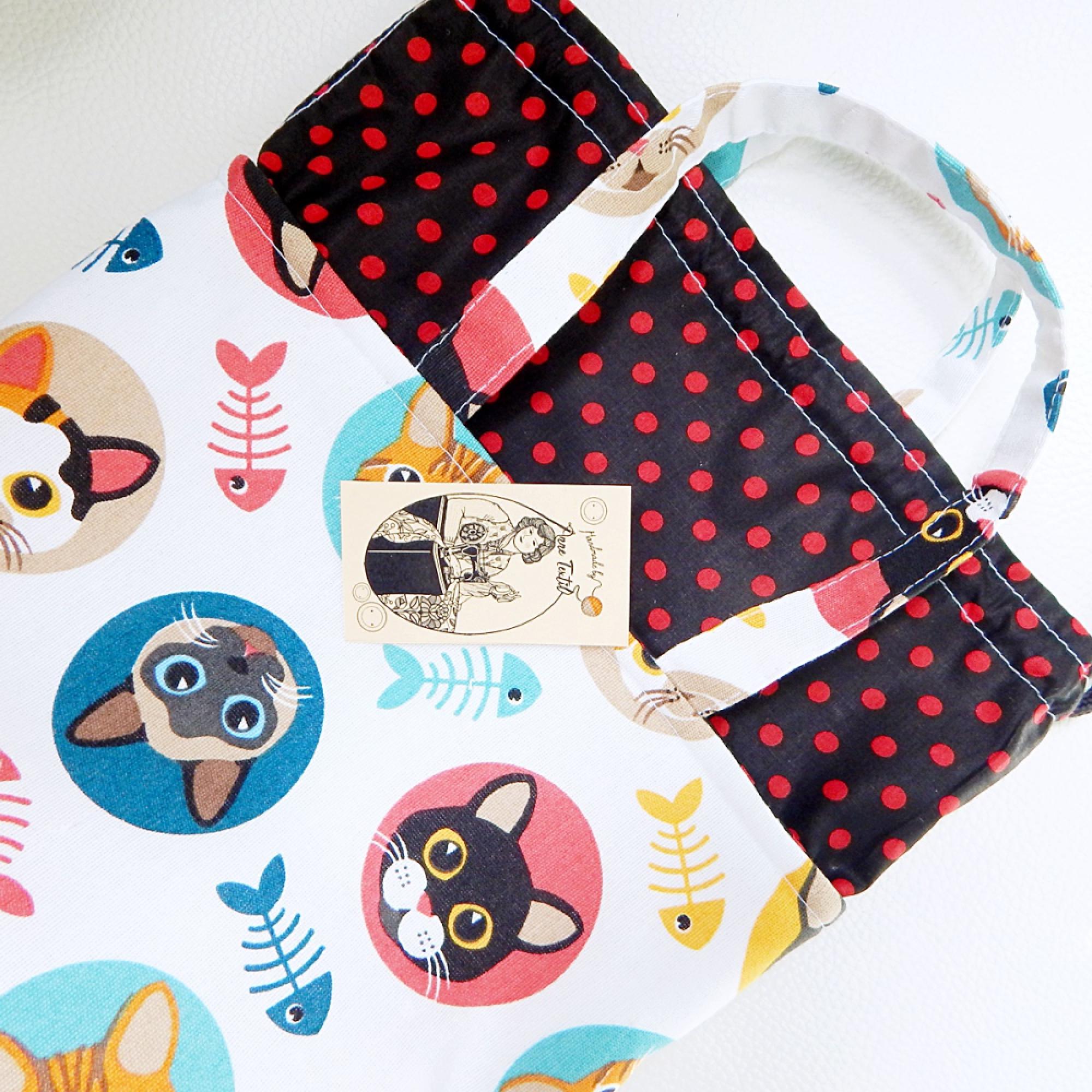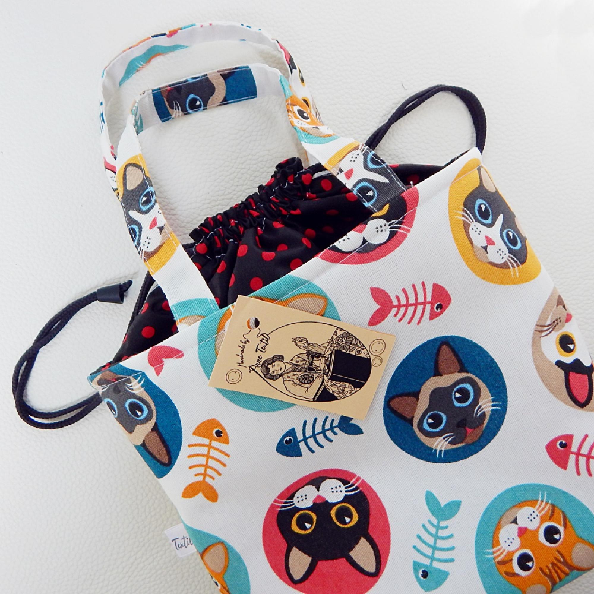 Ez a táska kívül cica portrés mintás és pöttyös mintás prémium minőségű lonetta és pamutvászon, belül vízhatlan fehér Pul anyagokból készült, a rétegek között bevasalt merevítő, és puha vlis lap fokozza tartását, és enyhe hőtartö tulajdonságát. A táska zsinórral összehúzható és kézi fogóval is rendelkezik. Kids Bag - Uzsonnás táska mérete: - magasság 27 cm, - szélesség 27 cm, - talpa 15 x12 cm A PUL belső rész vízhatlan, nedves szivaccsal lemosható, letörölhető, a felhasznált anyagok Oeko-Tex minősítéssel rendelkeznek. Önsúly kb. 150 gramm