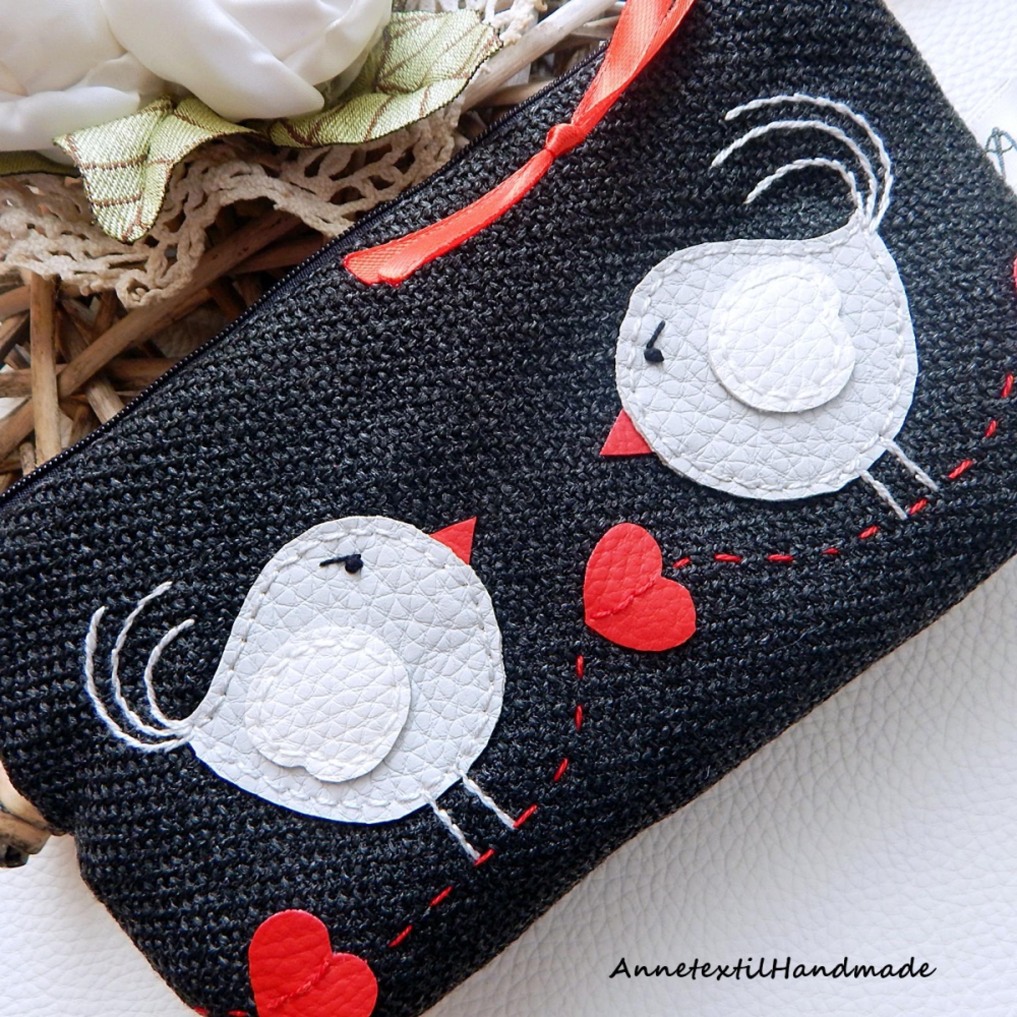 Fekete színű szövet alapra készítettem ennek a modellnek a legújabb változatát, melyen most is mint minden évben Valentin-nap előtt, együtt dalolnak a madárkák. Egyedi magas minőségű, kézi kidolgozással készülnek ezek a minták, így minden darab egyediséggel bír. Külső rész anyaga: fekete bútoripari, erős szövet, Bélése: a külső résszel harmonizáló, piros alapon fehér pöttyös mintás pamutvászon, a rétegek között közbéléssel. Cipzárral záródik. Neszesszer mérete: - magasság: 10 cm, - szélesség: 20 cm, - talp oldal szélessége: 5 cm