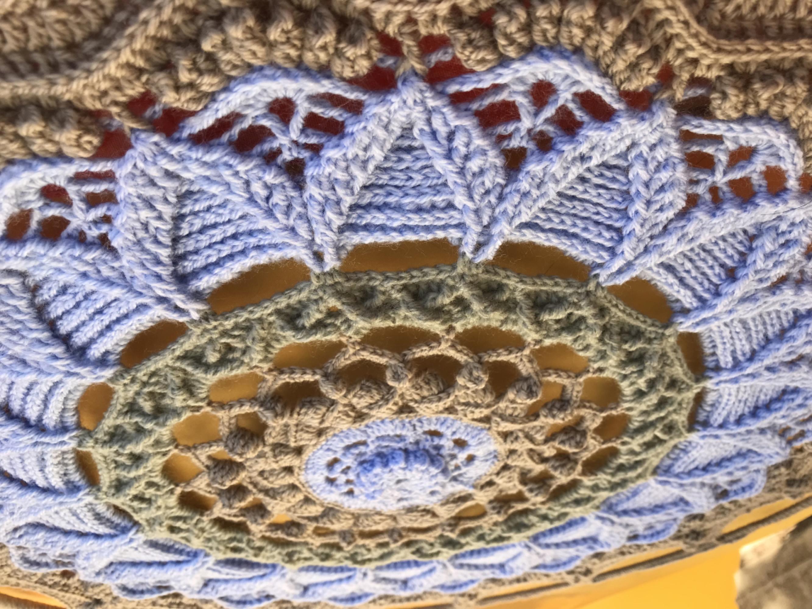 Nagy méretű, kézzel horgolt mandala. Élén, Harmonikus színekben. Energiával ölti fel a helységet. Drót keretre van felfeszítve.