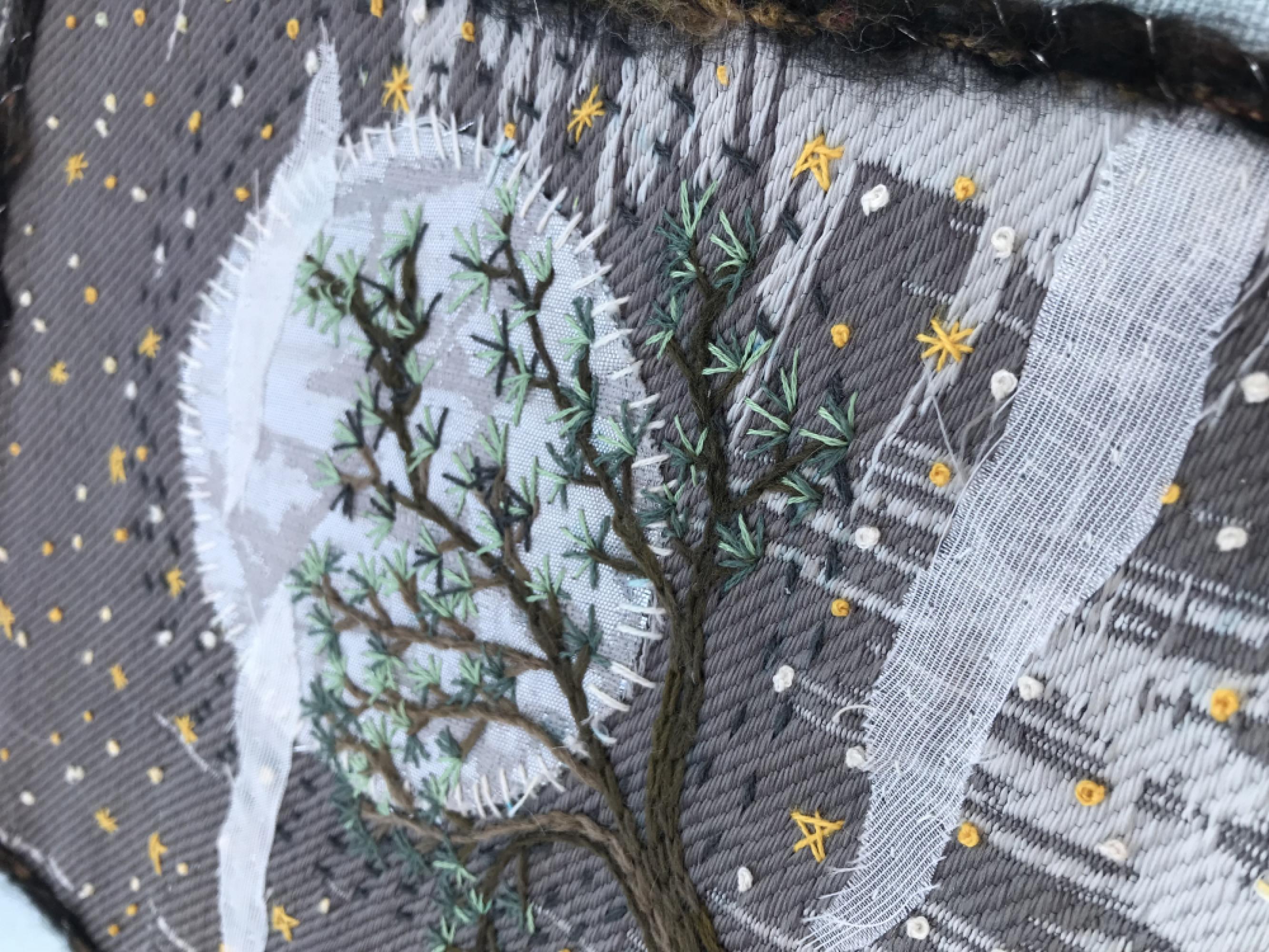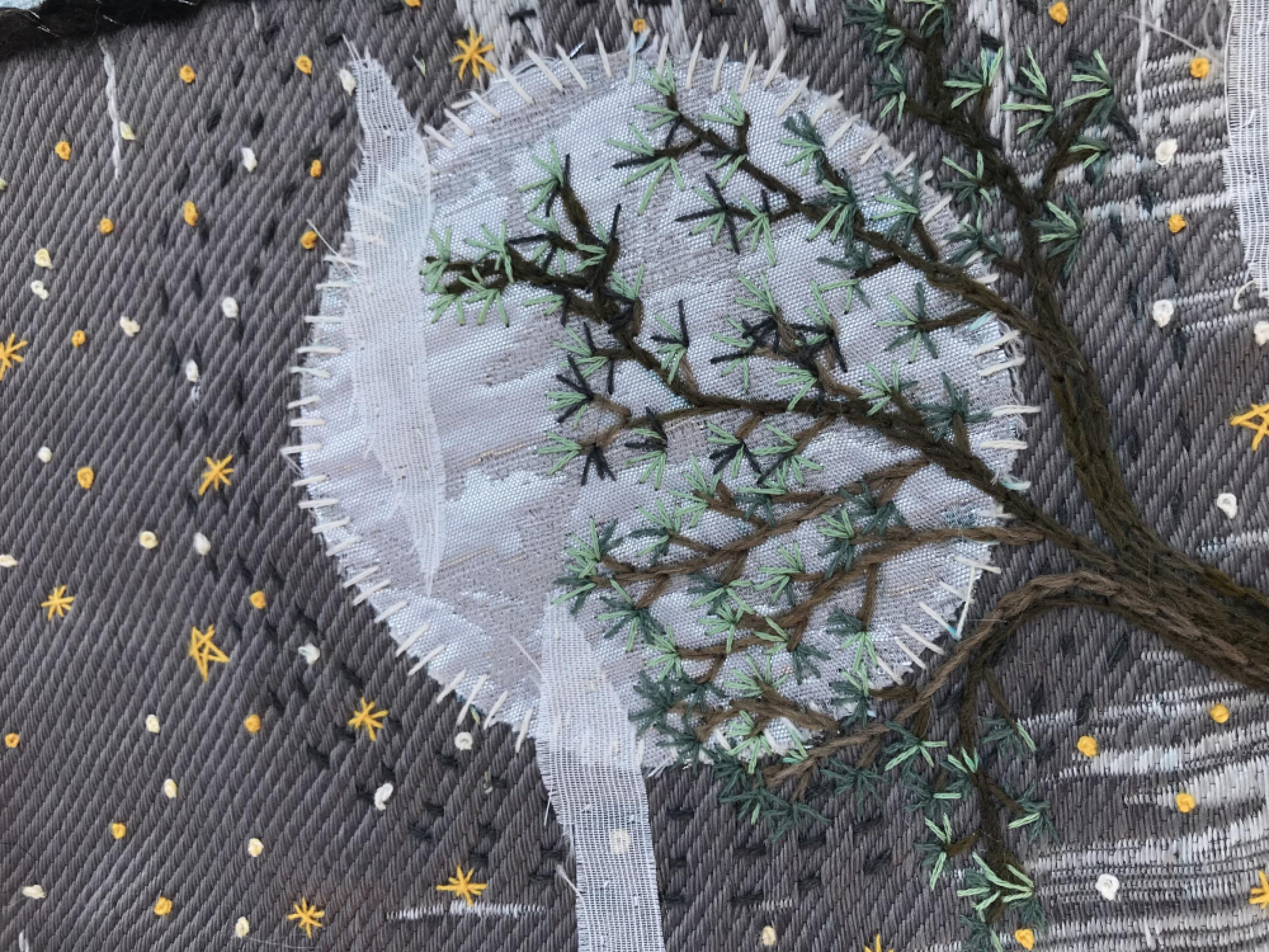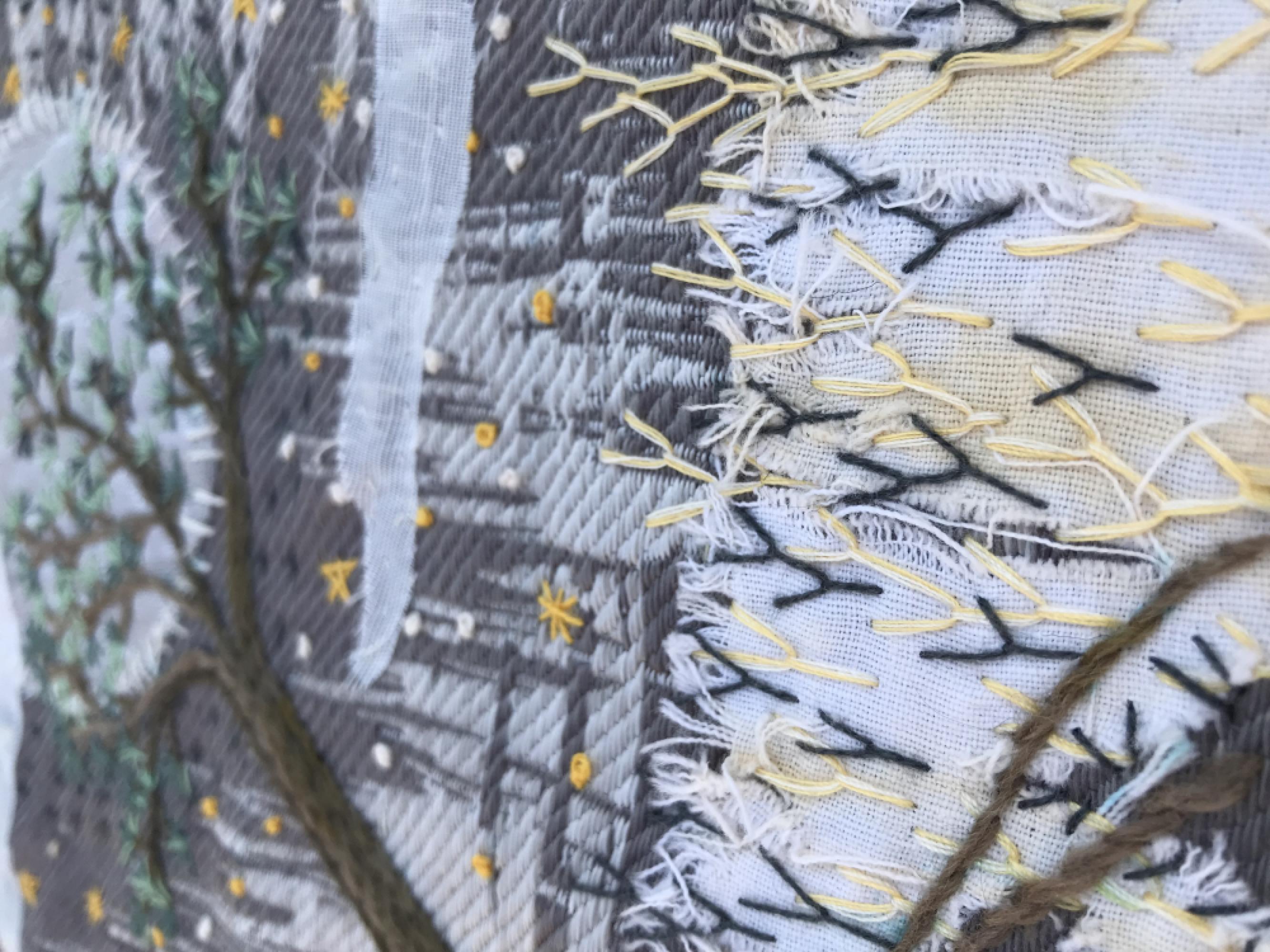 Hímzett fali dekoráció. Teljes egészében kézzel készítettem. Kevert, mixelt technikával: textil, hímzőfonal használatával. A keretet moherfonallal dísztettem. Festmény hatású, mégis a motívumok kidomborodásával életre kell, így részévé válik a környezetének. Hangulatos témája, homogén színei kellemesen illik bármilyen helységben. Otthonába vagy munkahelyén egyaránt.