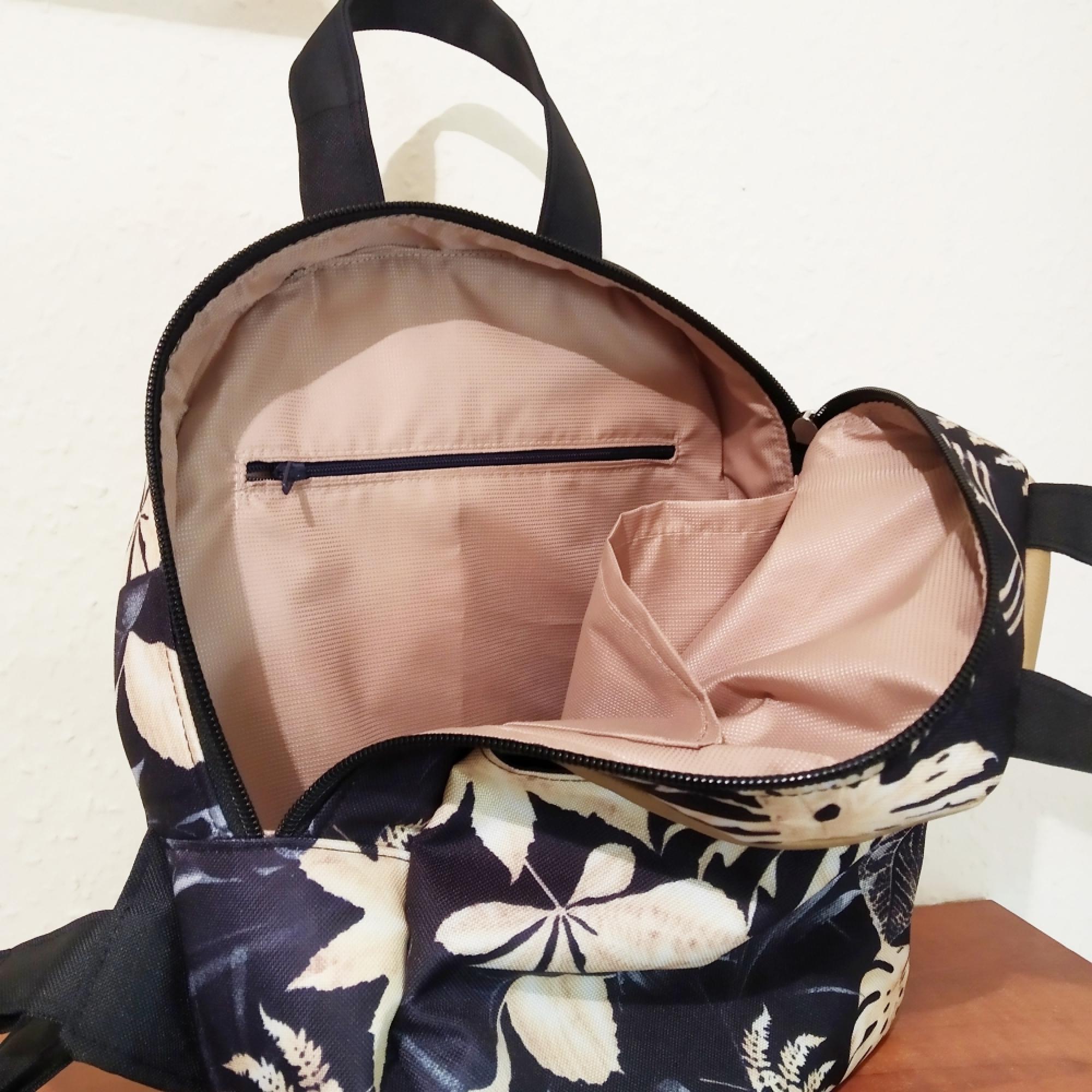 Sötétkék és arany,arany levelek. Cordura vízálló anyagból készült háti táska, kívül-belül vízálló. Belseje világos drapp,egy zippzáras,egy nyitott zsebbel.Két kézi fület kapott, így hordható kézben is, mint egy retikül.