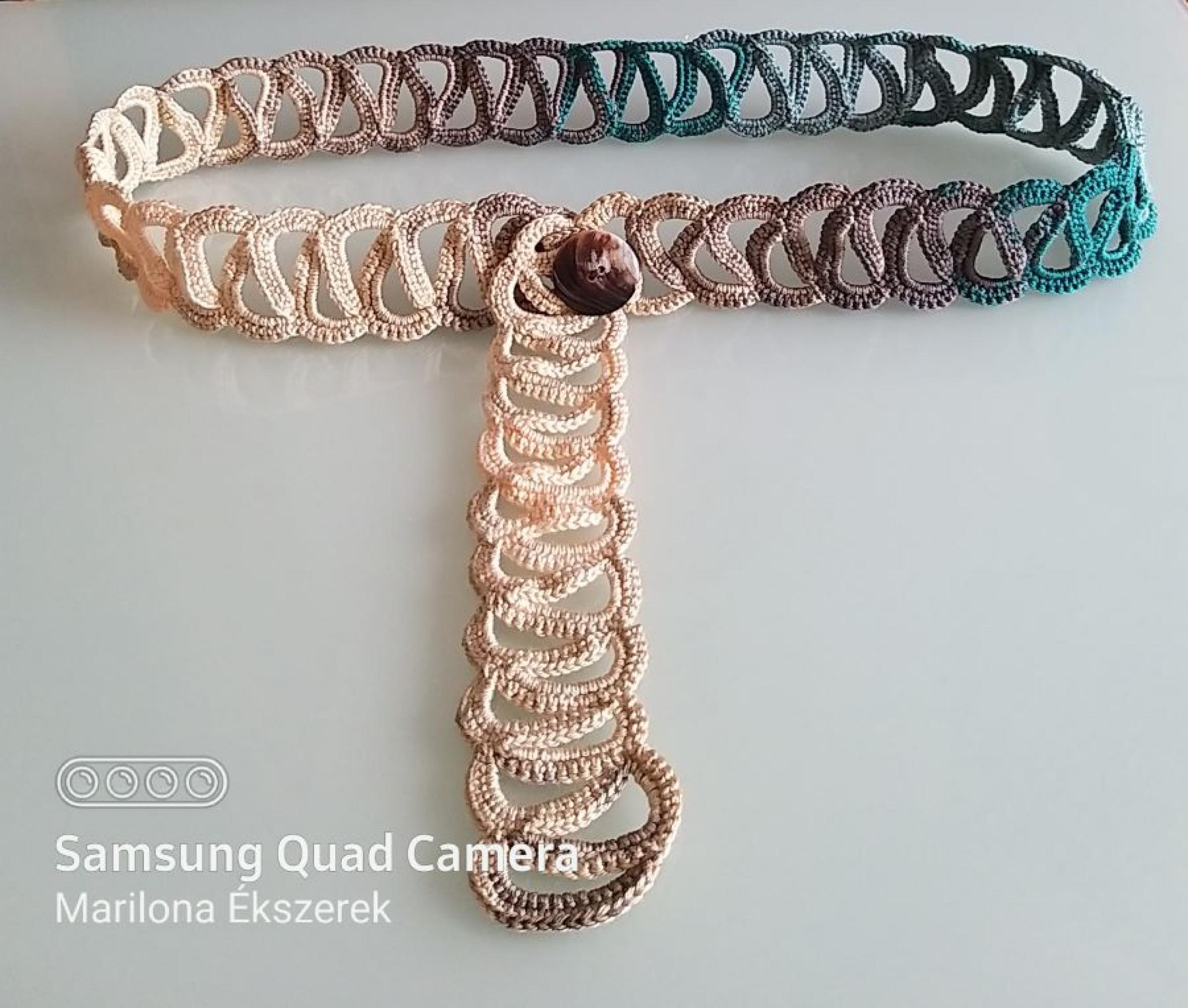 Szinátmenetes öv, drapptól a zöldig. Több színárnyalat is megtalálható benne, így jobban illeszkedik a megfelelő ruhához. Mintázata lukacsos, ezáltal a gombolása tetszőleges. Minden mérethez igazodik, gomb divatosan elegáns, barna és drapp illik az öv színvilágához. Mérete 115 x 4,5 cm. Tisztítása: kézmeleg vízben mosható! Ajándéknak is kitűnő választás!