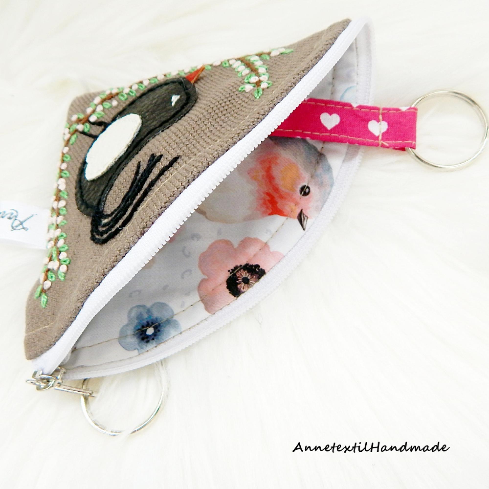 Hímzett virágos madaras homokszínű körcikk kulcstartó