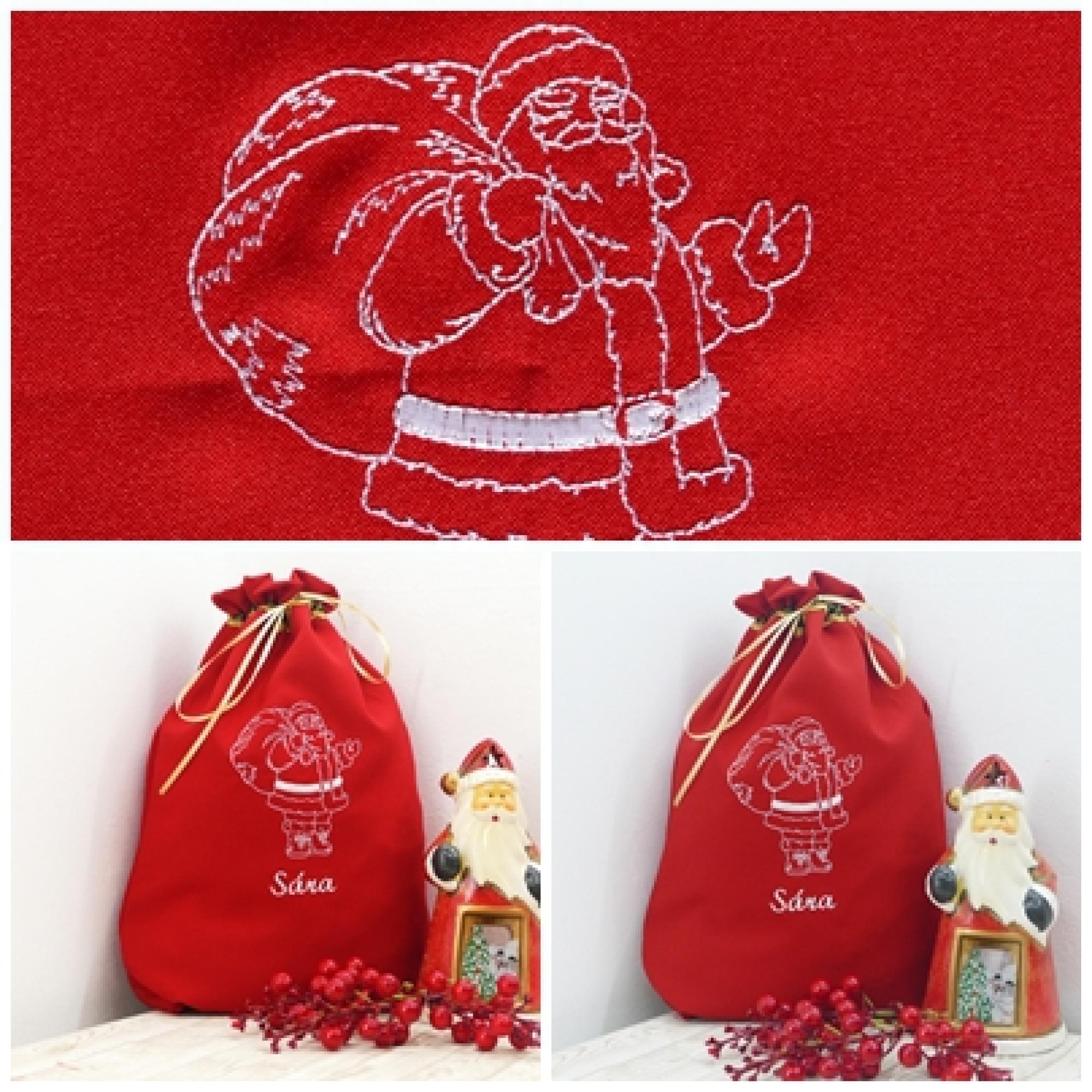 Névre hímzett mikulászsák. Mivel a mikulás mindenkit személyesen jól ismer,(jótettekkel-csínyekkel együtt) így az ajándék is személyre szól, mely a külseje miatt, már kibontás előtt meglepetés és ajándék egyben. Mikuláspiros anyagra fehér gépi hímzés, alkalomhoz illő színösszeállítás. Az elkészült darab 35cm magas és 25cm széles.