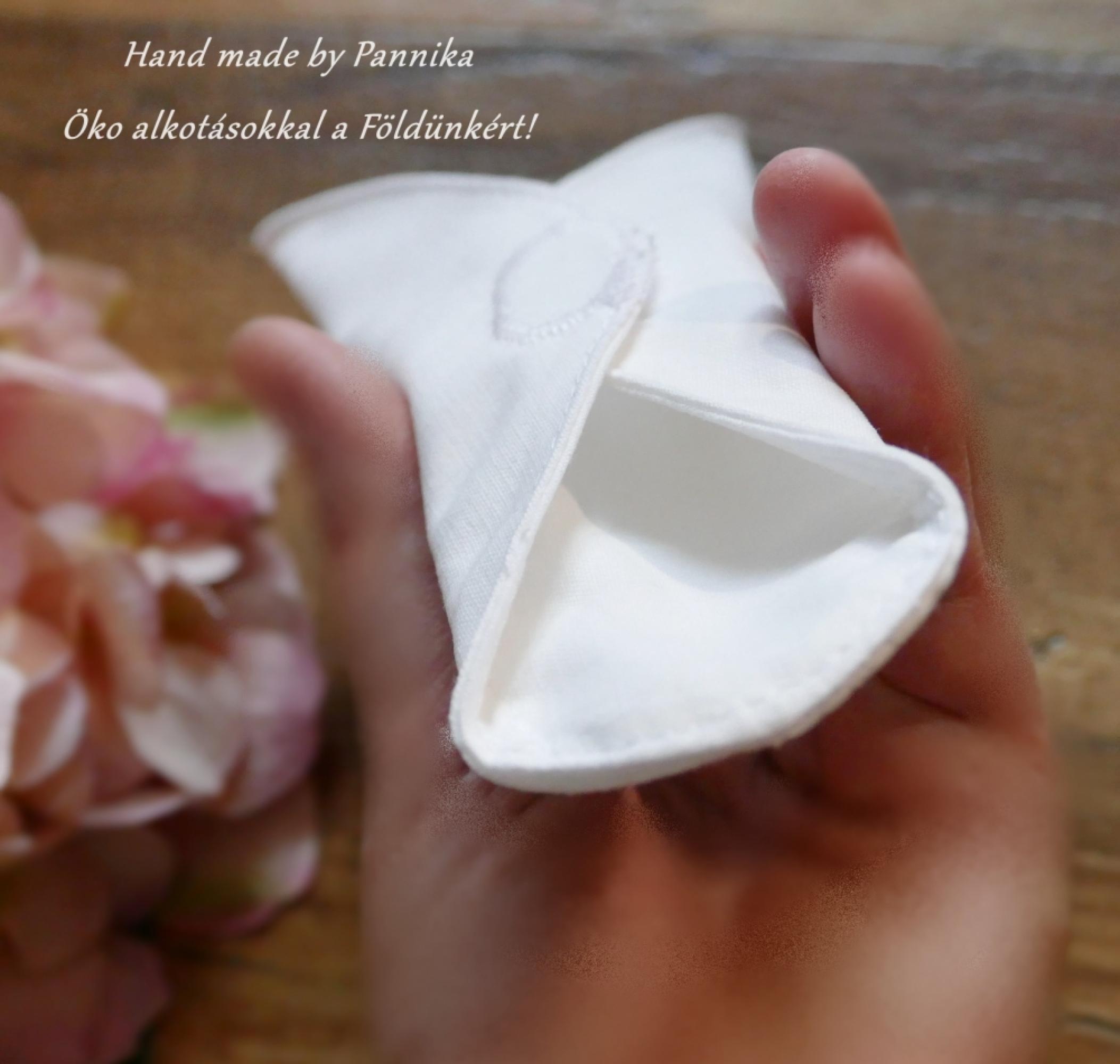 Tisztasági, intim betétet készítettem, fehér ökovászonból. Középen frottírral béleltem, amit szabadgépi tűzéssel gondosan levarrtam, hogy el ne mozdulhasson, mosás-viselés közben. magassága: 18cm szépessége fönt: 7cm lent: 3cm kinyitva: 13.5cm Környezetbarát, nowaste, Zero Waste termék Védd te is a Földünket! :) Tépőzárral rögzíthető a két szárny egymáshoz. Én jobban szeretem, mint a patentot, mert nekem ez kényelmesebb. Az anyagok avatottak. 40 fokon mosható, vasalható, nem kényes vászon. Tiszta, füstmentes környezetben készülnek, de első használat előtt mosd és vasld is ki!!