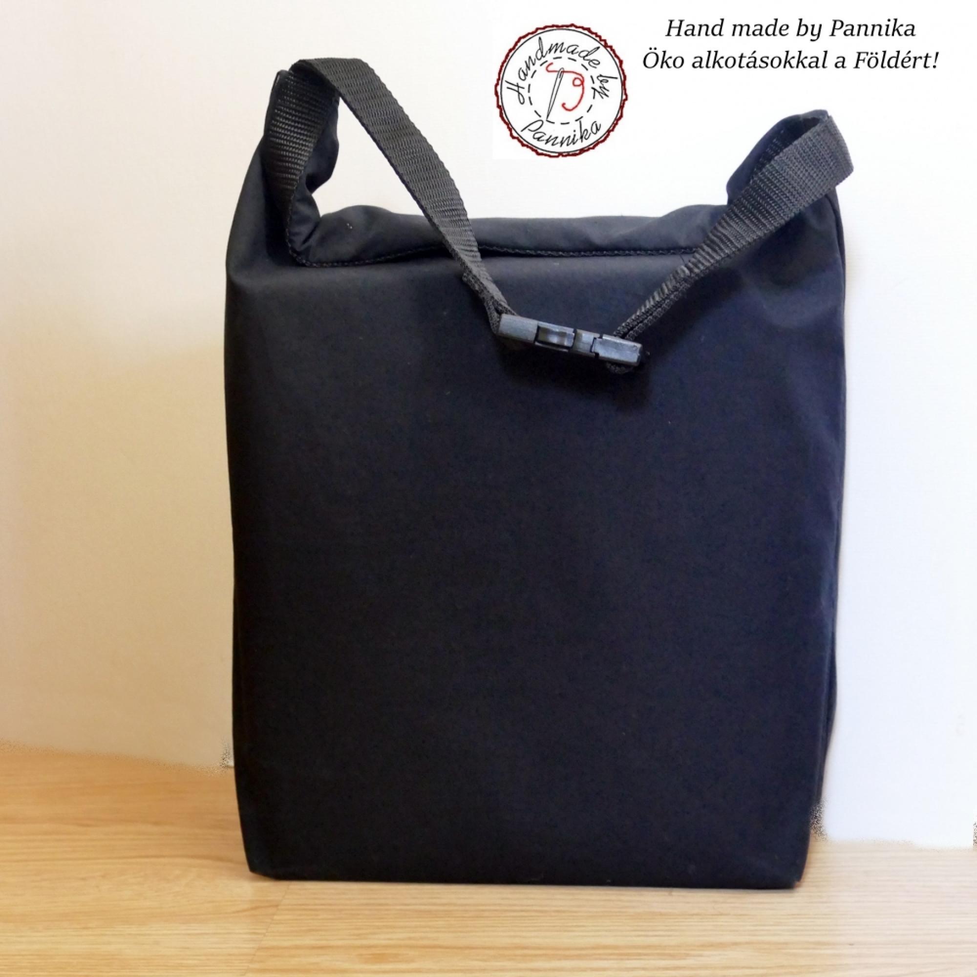 Uzsonnás táska, csatolható pánttal, hordozhatod ebbe a táskában az uzsonnát, ebédet. Nagyos nagy a pakolhatósága!! Palackot, ételhordó dobozkákat, csokit, kekszet :) mindent amit szeretnél:) VÍZHATLAN letörölhető BÉLÉSSEL. Pakold és vidd!!! ÉÉÉS: Van egy jó hírem: NEM CSAK ételhordóként, hanem akár kézi vagy válltáskaként is viheted!!! A fület nagyobbra készítettem így válladra is akasztható. FIÚK- LÁNYOK egyaránt használhatják. Praktikus , trendi, vagány mindenhez is illik. A táska külsőrésze fekete vászon, belseje fehét víztaszító szövet anyagokból készült. Mosás 30 fokon vagy kézzel. A belsejét kihuzhatod és kitörölheted, ha kell. Nem kell állandóan mosni az egész tasit. NE száritógépezd! Vasaláskor húzd ki a belső anyagot és azt ne vasald, mert a vasaló összerántja!! Mérete bezárva: 33 magas, de lejjebb tekerhető akár 20cm-ig. Még akkor is szép. szélessége: fent 36cm lent 26,5cm talpszél 11cm a pánt 38cm Ha vállra vennéd: a táskával a vállkör:74cm