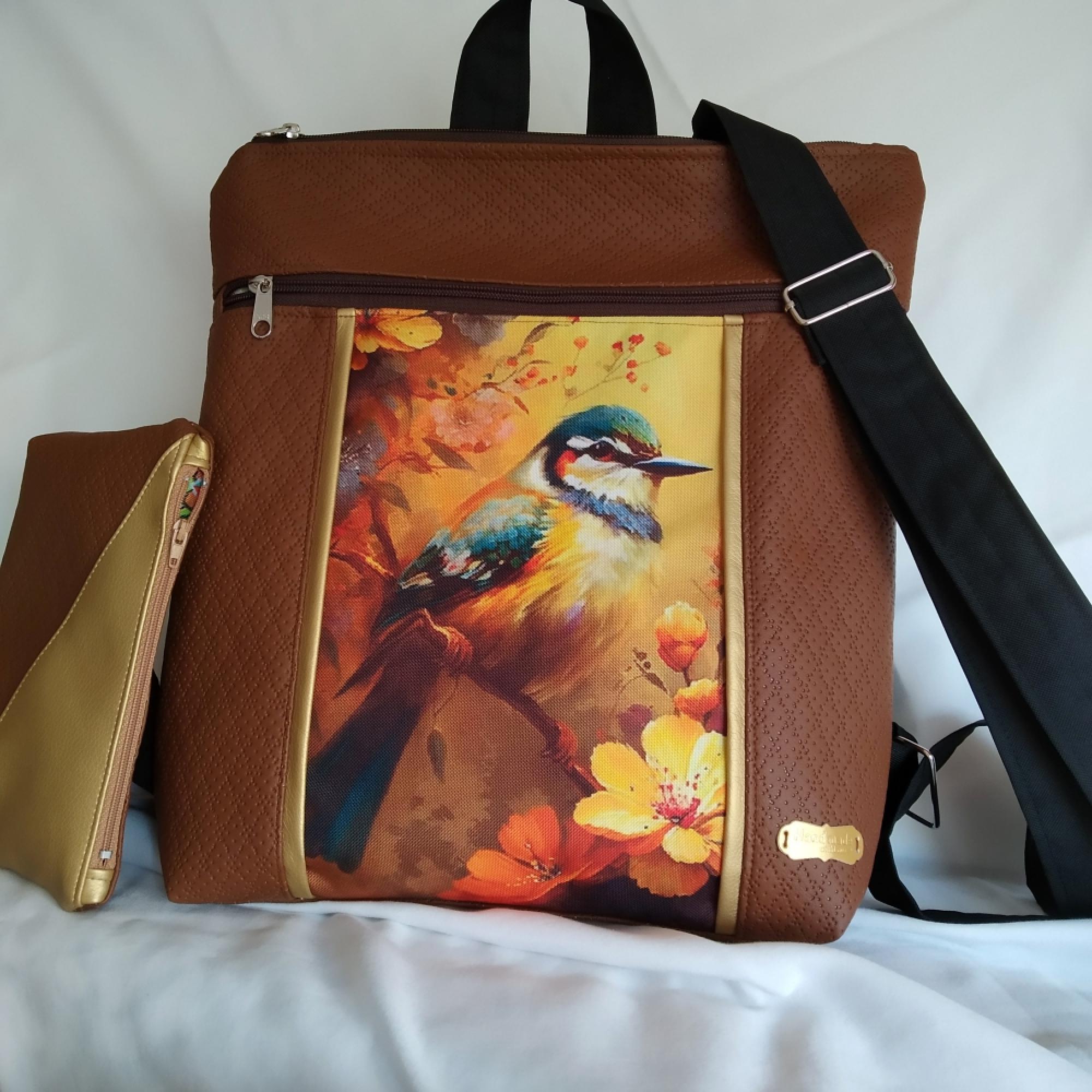 Elkelt! Az ősz színeiben pompázó madárkás háti táska szettet hoztam. A táska anyaga csauszínű steppelt műbőr és egy gyönyörű madárka mintás vízálló panel díszíti az elejét. A madárka panel egy hosszú zsebet takar. Teteje magasan záródik, zippzárral. Rögzített pántos, pántjai 115 cm, vízálló anyagból készült. Belseje mandala mintás pamutvászon, egy rátűzött zsebet kapott. mérete: magasság 35 cm,szélesség 34 cm, alja 9 cm, vállpántok szélessége lehet 3 vagy 4 cm. Neszeszer 20x12x2 cm.