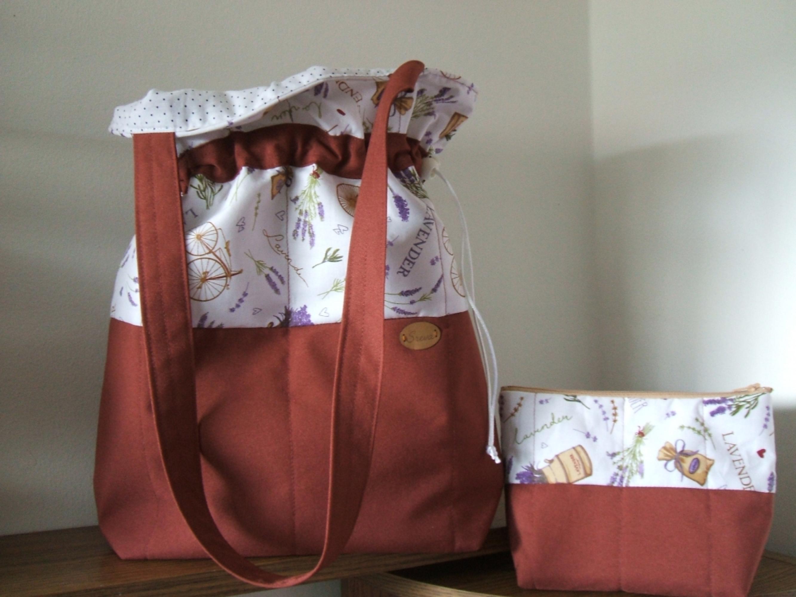 Elkelt! A föld színei kedvelőinek készítettem egy nagyon szép rozsdabarna alapon, lila levendulás mintával táskaszettet. A táska anyaga minimat és pamutvászon. A táska teteje zsinórral és szabályozóval zárható. Füle 70 cm hosszú. Belseje fehér alapon sötétkék tűpettyes pamutvászon, egy nagy belső zsebbel. A szett máshol elkelt.
