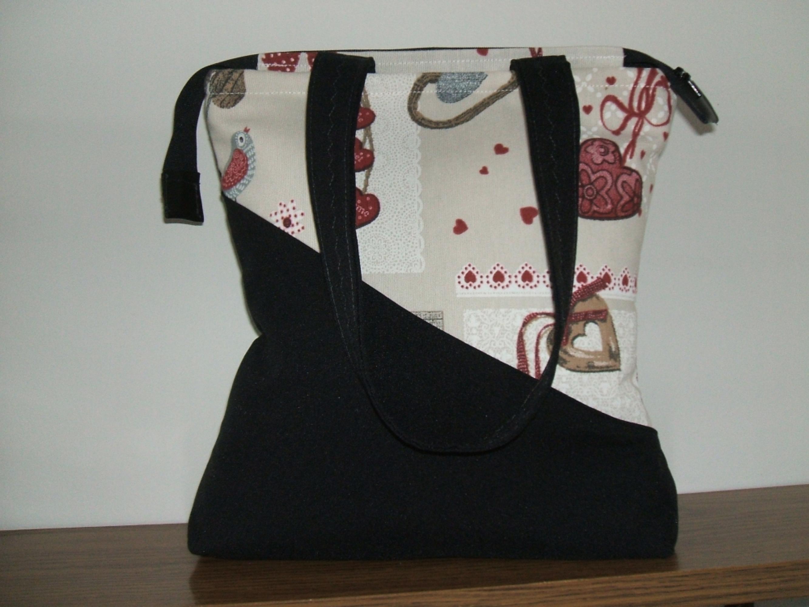 Elkelt! Kisméretű válltáskát készítettem Eleje, alja és háta fekete. Anyaga fekete panama szövet és bordó szivecskés-madárkás mintás dekorvászon. Elejét kissé bekarcsúsítottam, ezáltal csinos nőies vonalat kapott, elegáns válltáska lett belőle. Hátára a belsejével azonos színű zsebet kapott, ami kissé feldobja, tetejére emelt cipzár talprész került, ami megemeli , magasítja a táskát és a kényelmesen nyitható cipzárat. Belső része világos mintás zsorzsett anyag, egy nagyobb nyitott és egy zippzáras zsebbel. Tisztítása kézzel 30 fokon, formára igazítva, vasalni nem szükséges.
