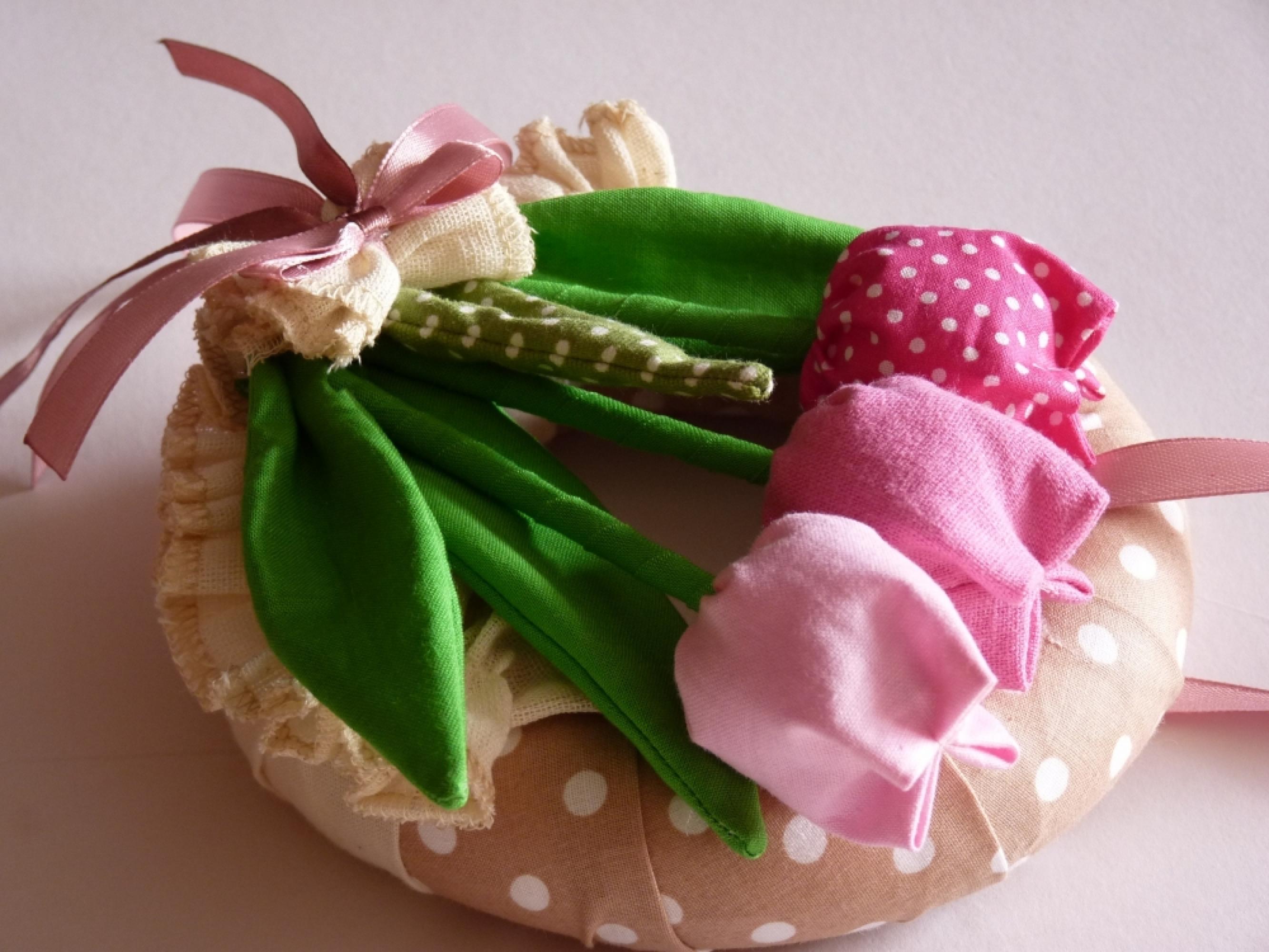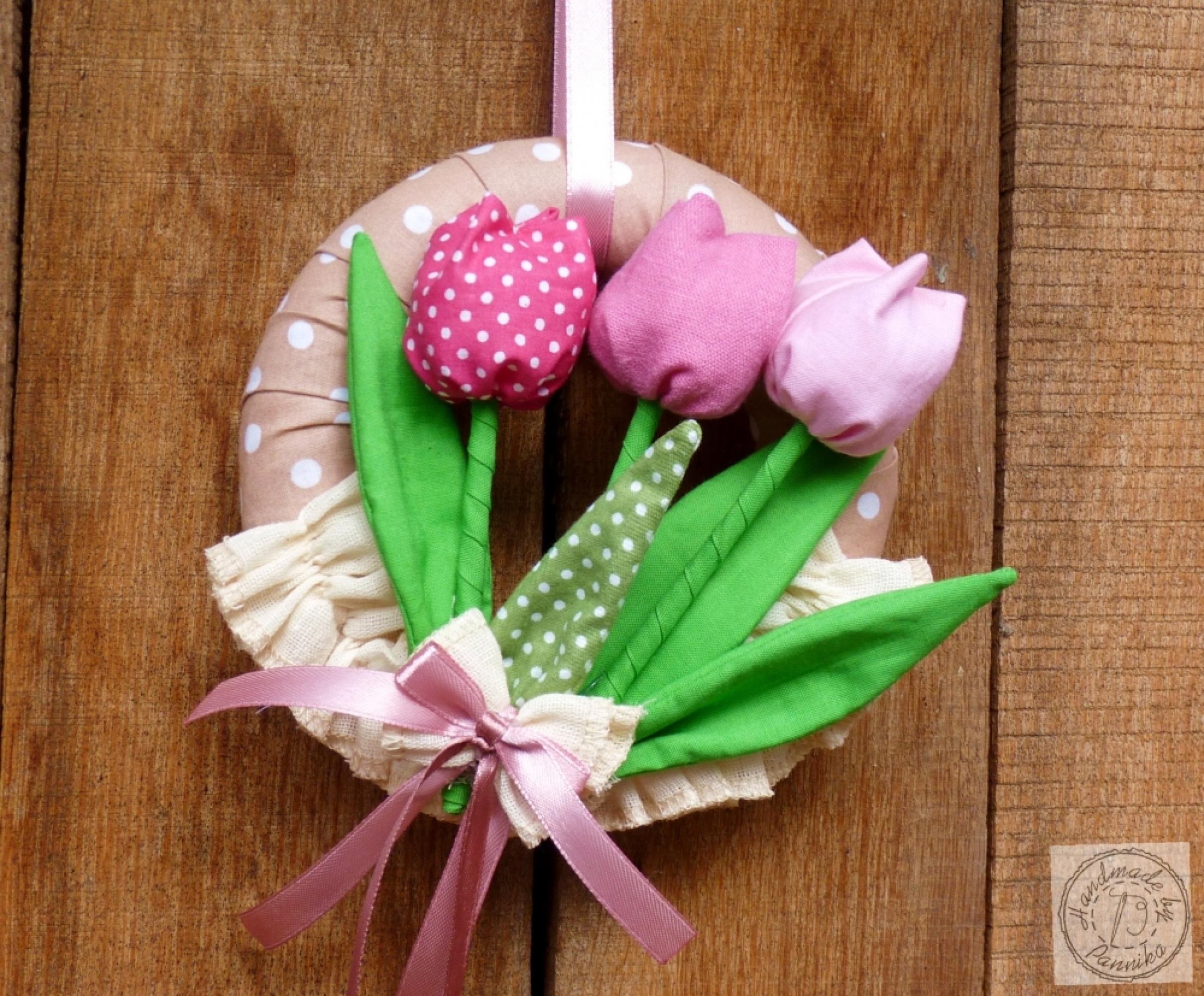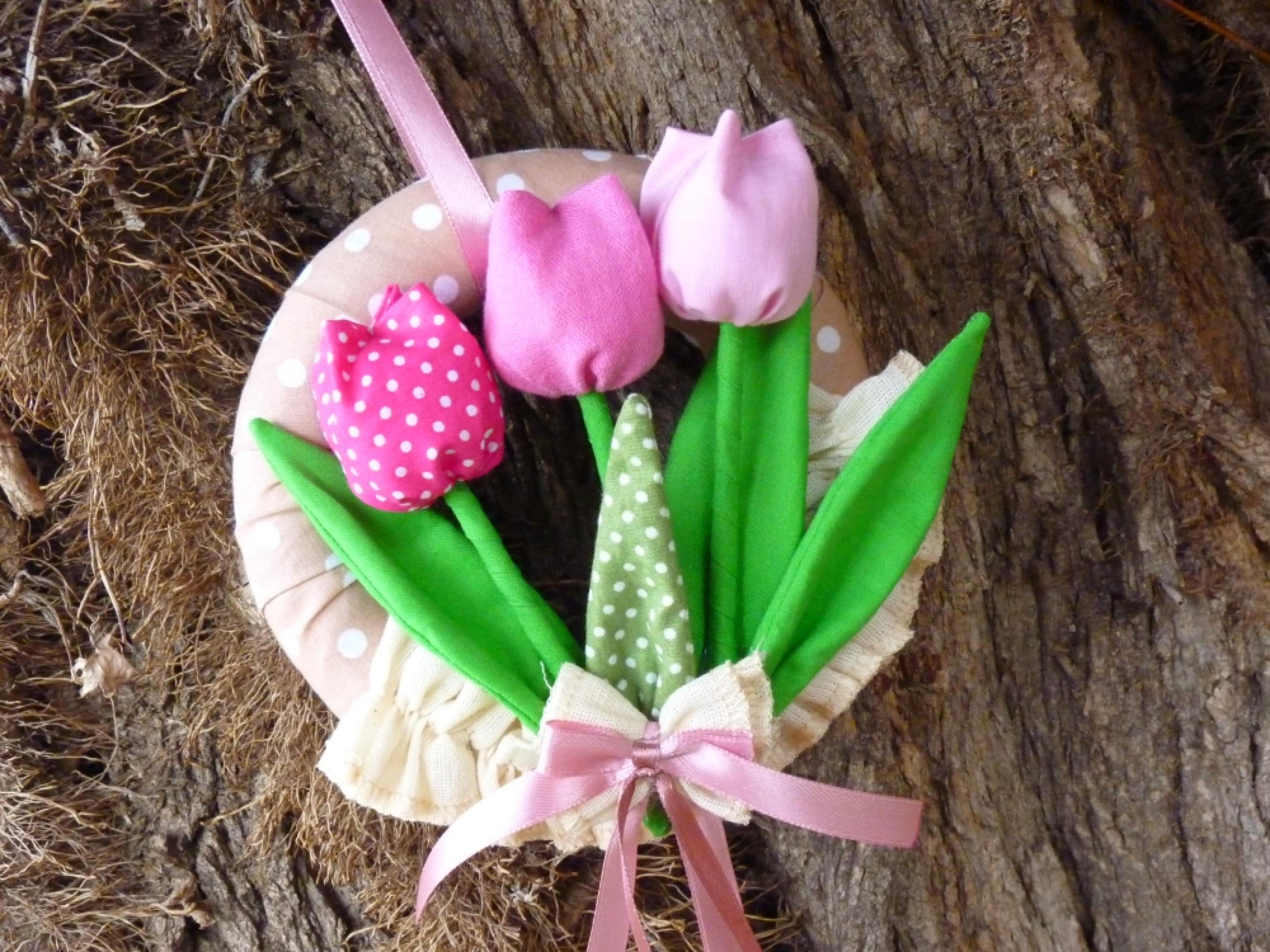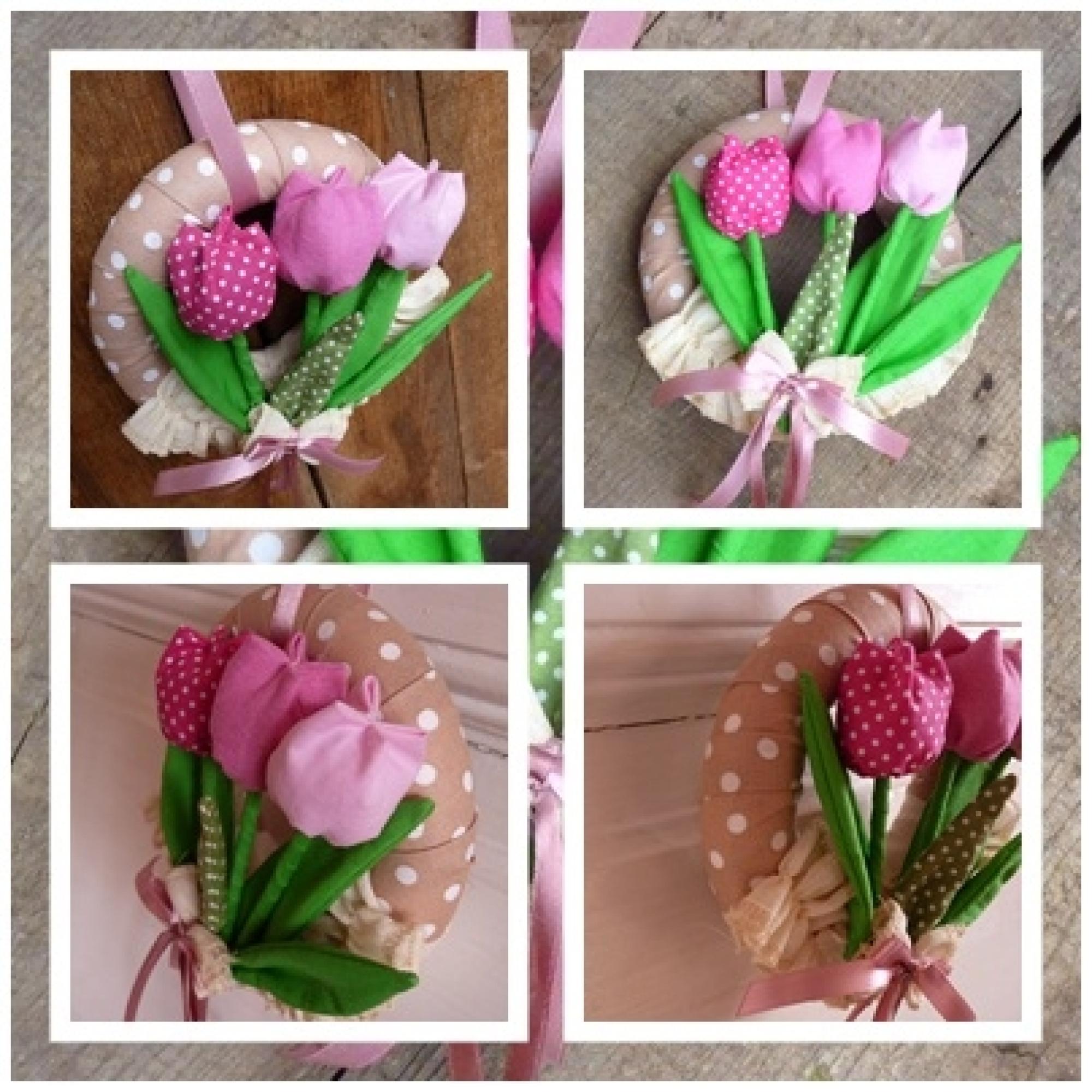 Három rózsaszín tulipánnal díszített kis vintage koszorú.