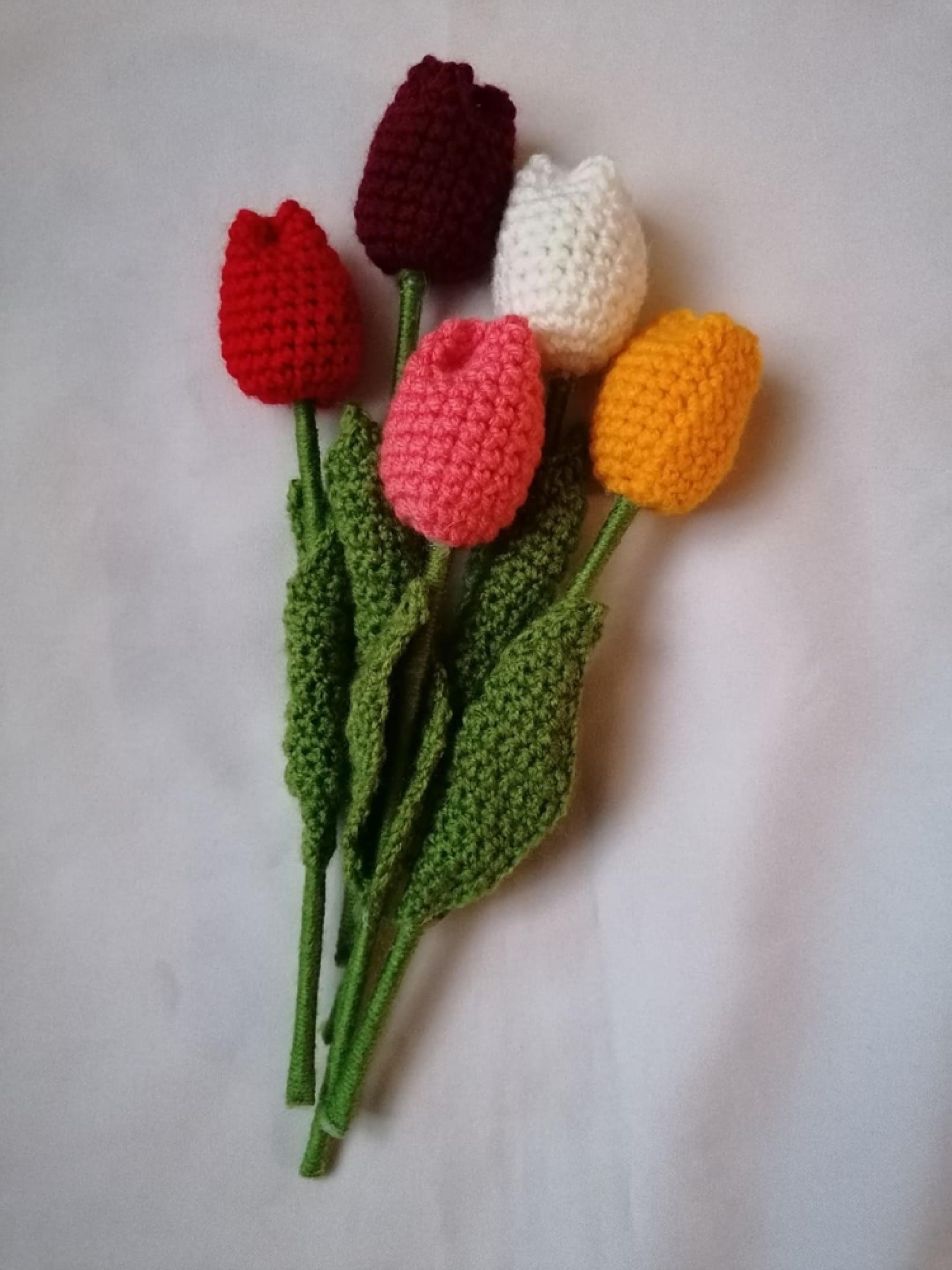 Horgolt tulipánok készültek nőnapra,anyák napjára vagy csak úgy ajándékba lakásdekorációnak. Mérete26cm. Szára szívószál benne egy vékony drót ezáltal hajlítható. Szállítás mérete miatt csomagként,postacsomag automatába vagy postán maradó küldeményként tudom.