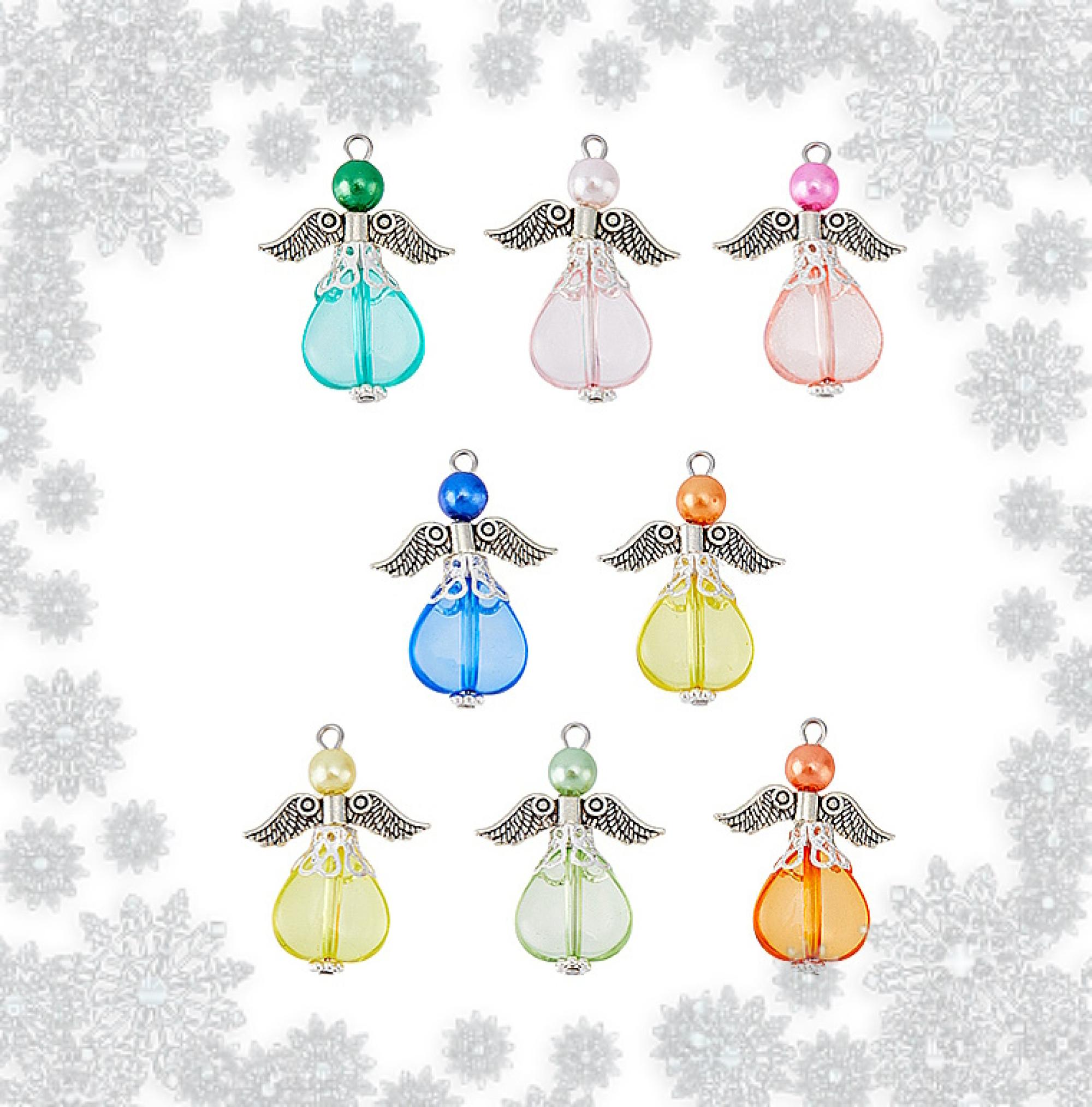 Az angyalkák akril és viaszgyöngyből, fém angyalszárnyból és gyöngykupakból készültek.